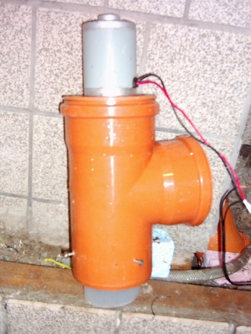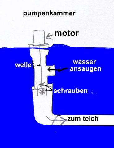 Rohrpumpe von LoboHallo, hier möchte ich meinen Rohrpumpen Bau vorstellen. ![]() An die Motorwelle habe ich eine 8mm Gewindestange angebracht. Diese geht bis ans Ende vom T-Stück. ![]() Am Ende der Stange habe ich zwei Modellschiffsschrauben befestigt. Da diese kleiner sind als das 110er KG-Rohr, habe ich dieses unten bei den Schrauben auf 70er verjüngt. Allerdings muss ich am Ende der Stange noch ein Lager anbringen, damit die Schrauben mittig laufen. Das Wasser wird von der Seite angesaugt und drückt das Wasser in den Rücklauf (110er KG-Rohr ca.10 Meter lang) zum Teich. ![]() Der Stromverbrauch über ein Batterieladegerät liegt zwischen 50-60 Watt. Ausgelitert habe ich noch nicht, aber rein gefühlsmäßig kommen da 7000-8000 Liter Wasser an. Auf den Zulauf im Teich (140cm tief) habe ich einen 90Grad-Bogen gesetzt und diesen nach oben gestellt. Die Wasseroberfläche bewegt sich mächtig, die Pumpe läuft jetzt schon seit zwei Tagen. Wie lange der Motor das mit macht - keine Ahnung. Wohlgemerkt, es ist erst mal ein Test. Hier eine schnelle Zeichnung, wie die Pumpe angeschlossen ist. ![]()