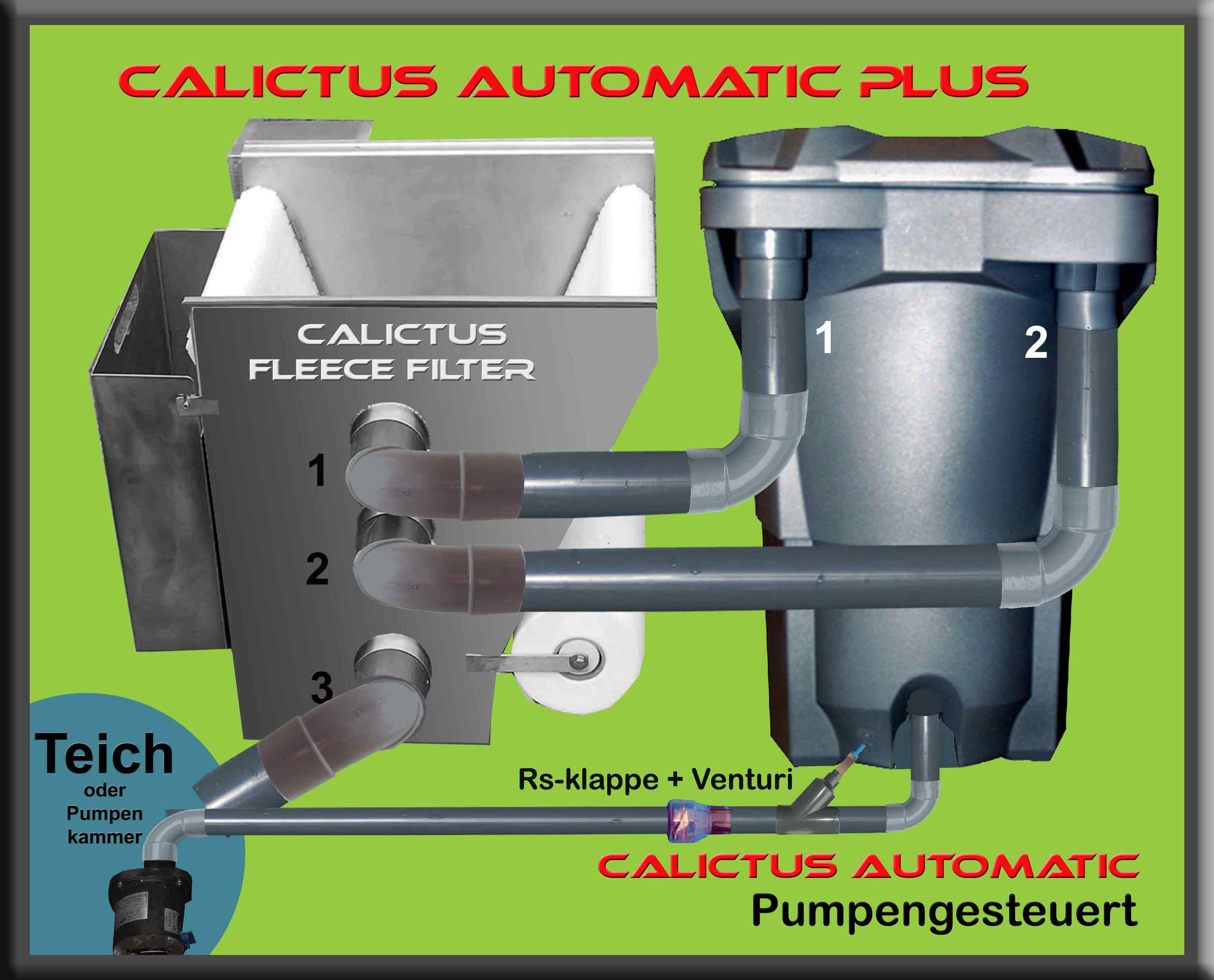 Bei dieser pumpengesteuerte Version stehen der Calictus Automat und der Calictus Vliesfilter oberhalb dem Wasserniveau.