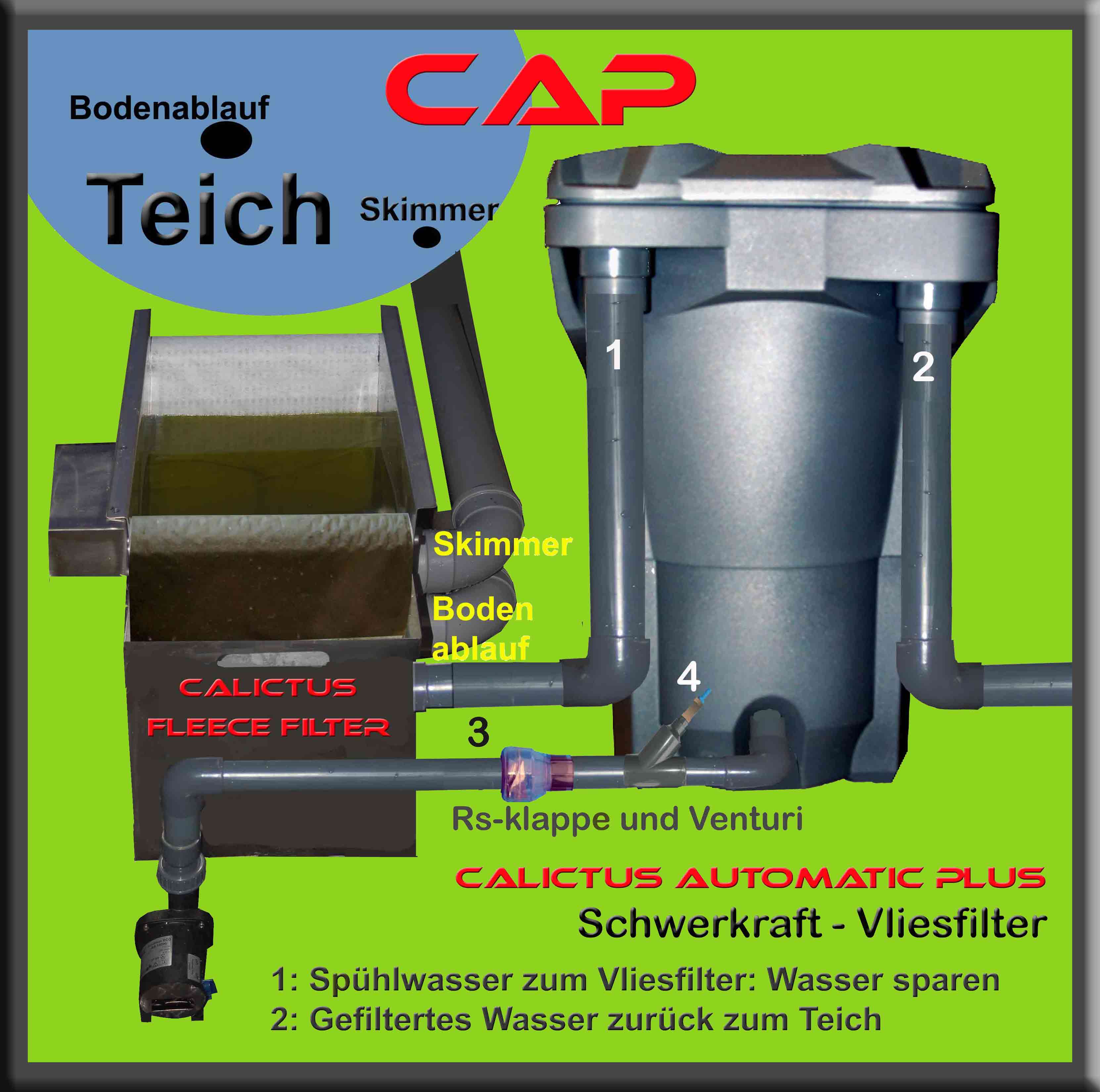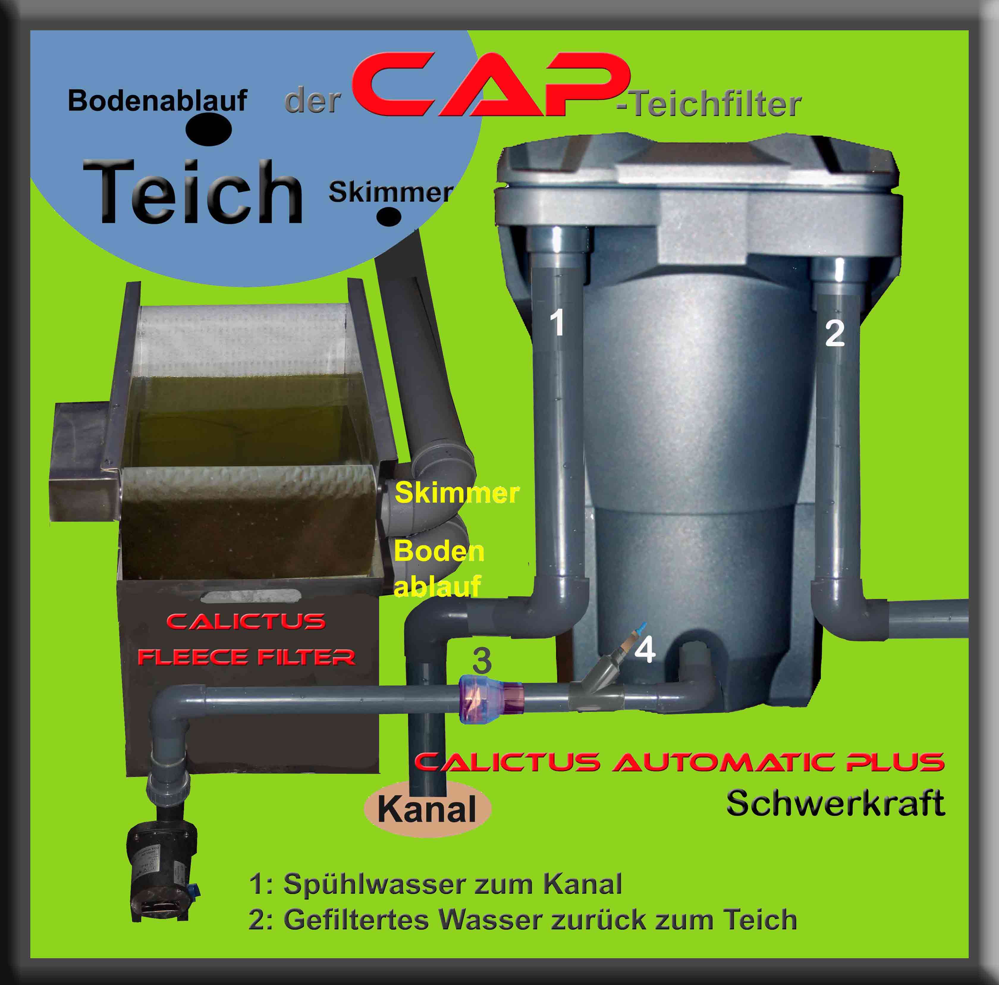 Filterschlamm entsorgt worden ist (1) , schaltet der Calictus Automat zurück in dem Filterstand und strömt wieder gefiltertes kristallklares Teichwasser zurück im Teich (2).