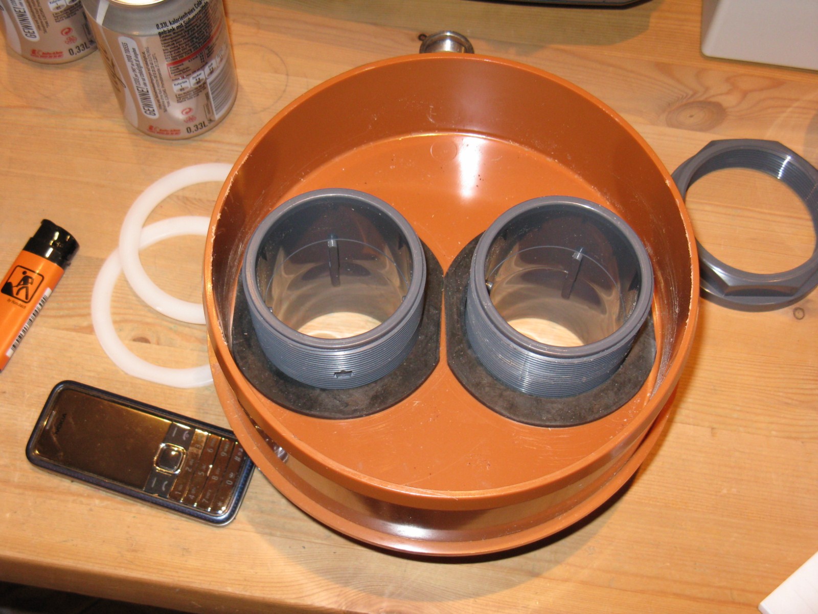 so der ozonvernichter ist fertig und zum aufstellen und verrohren am teich bereit, nur die verringerung auf ein 120mm rohr und das längere rohr fehlt noch, ferner natürlich noch die zwei uvc brenner die von oben in das verlängerrte rohr hinuntergelassen werden.