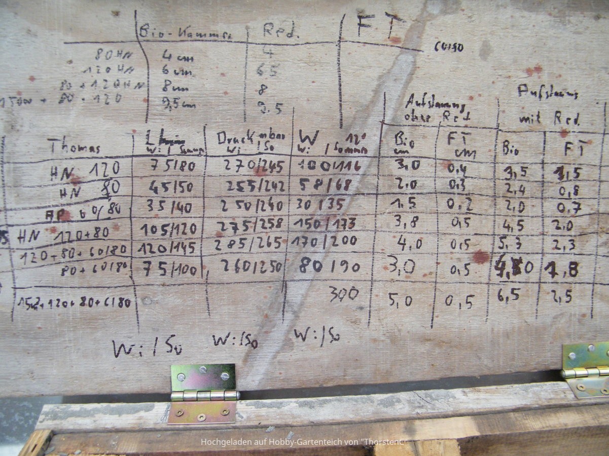 Mit viel Geduld die Aufstauung der Biokammer ohne Red. ausgemessen- und auch gleich die Werte der verschiedenen Membranpumpen.