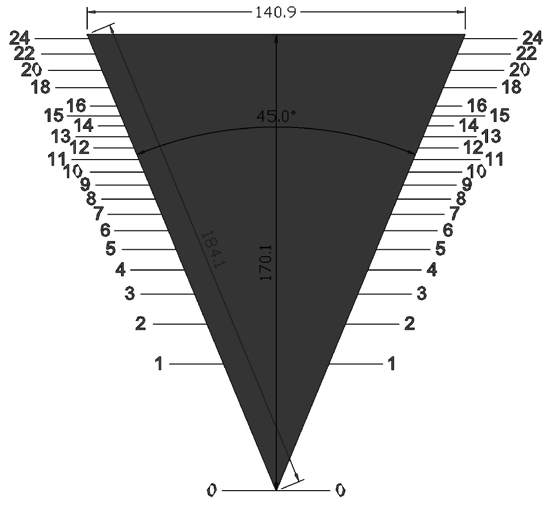 Daraus wurde dann eine Konstruktionszeichnung mit den notwendigen Maßen. Ein Winkel von 45° schien mir nach Überschlagsrechnungen des möglichen Messbereichs fürs erste optimal zu sein. 0,3m³-25m³