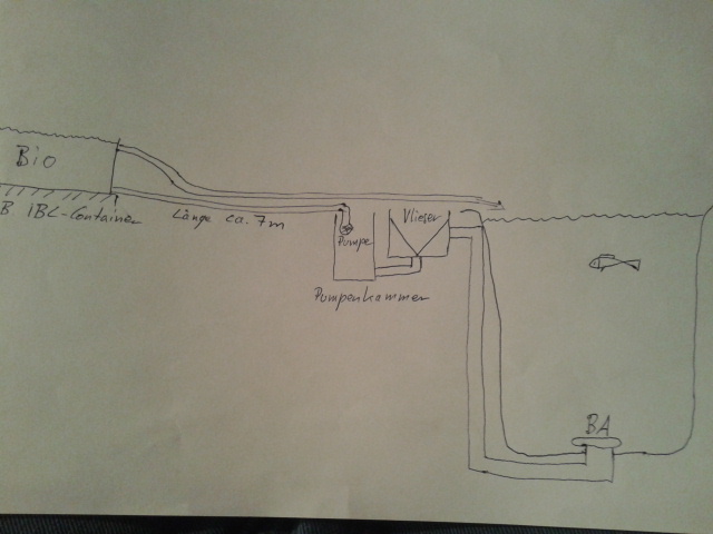 Teich hat 20000 Liter. Es soll direkt am Teich mein Mamovlieser in Schwerkraft mit den Bodenabläufen angeschlossen werden. Von dort aus fließt das Wasser in eine direkt anliegende Pumpenkammer. Von dort soll das Wasser mit einer Rohrpumpe (ca. 25000-30000 L/h) in den ca. 7m entfernten Biofilter gepumpt werden. Der Biofilter soll ein IBC-Container werden, bei dem der Einlass unten von dem IBC sein soll, damit ncht so eine große Höhe überwunden werden muss (Höhe ca. 30cm). Von dort aus fließt das Wasser, mit Auslauf oben am IBC, direkt zurück in den ca. 9m entfernten Teich. Nun die Frage, funktioniert das alles, vor allem mit der Rohrpumpe?