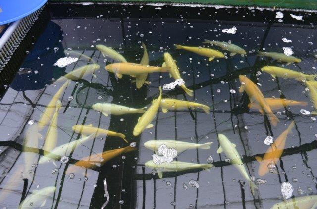 Die Spiele mögen beginnen… Als wir die Tür öffneten wusste ich sofort warum dies mein Lieblingsplatz für Selektionen ist. Mehr als 200 Koi mit einer Größe von 70-95cm in hervorragenden Qualitäten. Wir begannen mit der Selektion und schnell waren 6 Doitsu Karashi zwischen 75-80cm die usneren, alle 3 ½ Jahre alt. Die Karashi hatten unglaubliche Bodys und eine hervorragende Hautqualität. Zusätzlich selektierten wir noch einige HQ Sansai zwischen 70-78cm, darunter 2 Shiro Utsuri, Benigoi, Ginrin Karashi etc… Ich verhandelte mit Yoshiuki die Preise und so wurden wir uns schnell einig über die ersten 10 Sansai Biggies.