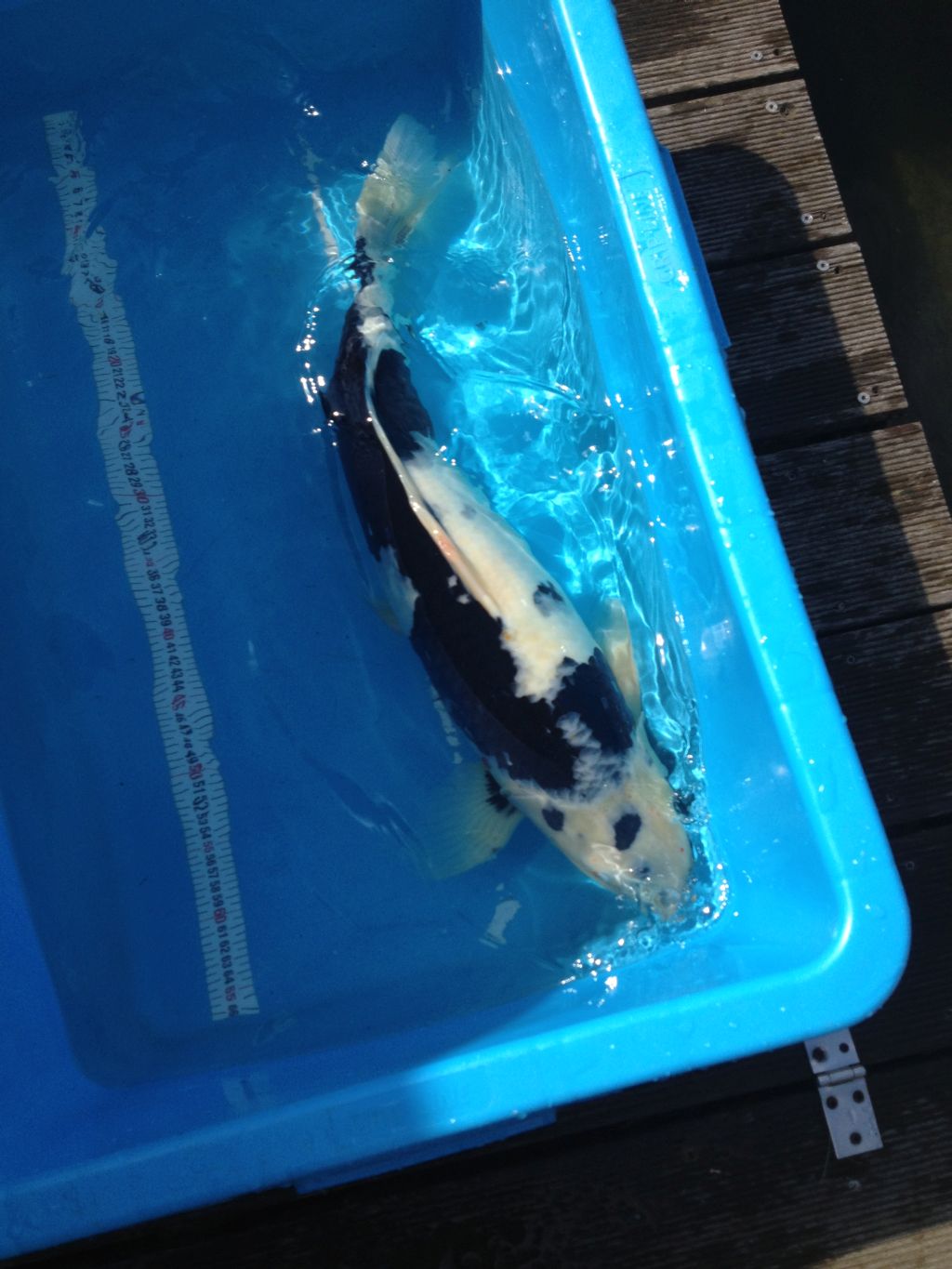 da muss ich natürlich auch nachlegen. Nachfolgend ein Update meines kleinen Shiro. Im Mai kam er aus der IH. Er ist nun genau 24 Monate alt und 40 cm groß. Die Wannenbilder sind leider weg. Über diesen Winter habe ich den Gosanke zuliebe Farbfutter beigemischt, was man dem Shiro auch deutlich anmerkt. :oops: