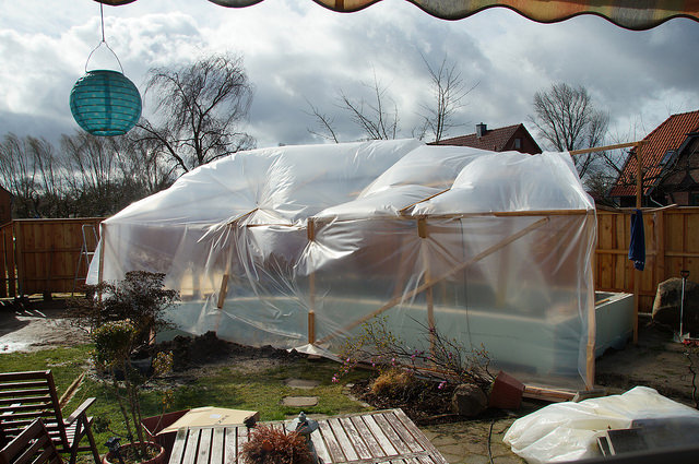 Ich hatte erstens keine Lust, zweitens keine Kohle eingeplant und wollte mich auf eine vernünftige Abdeckung konzentrieren, da die meiste Wärme wohl über die Teichoberfläche entweichen würde.
