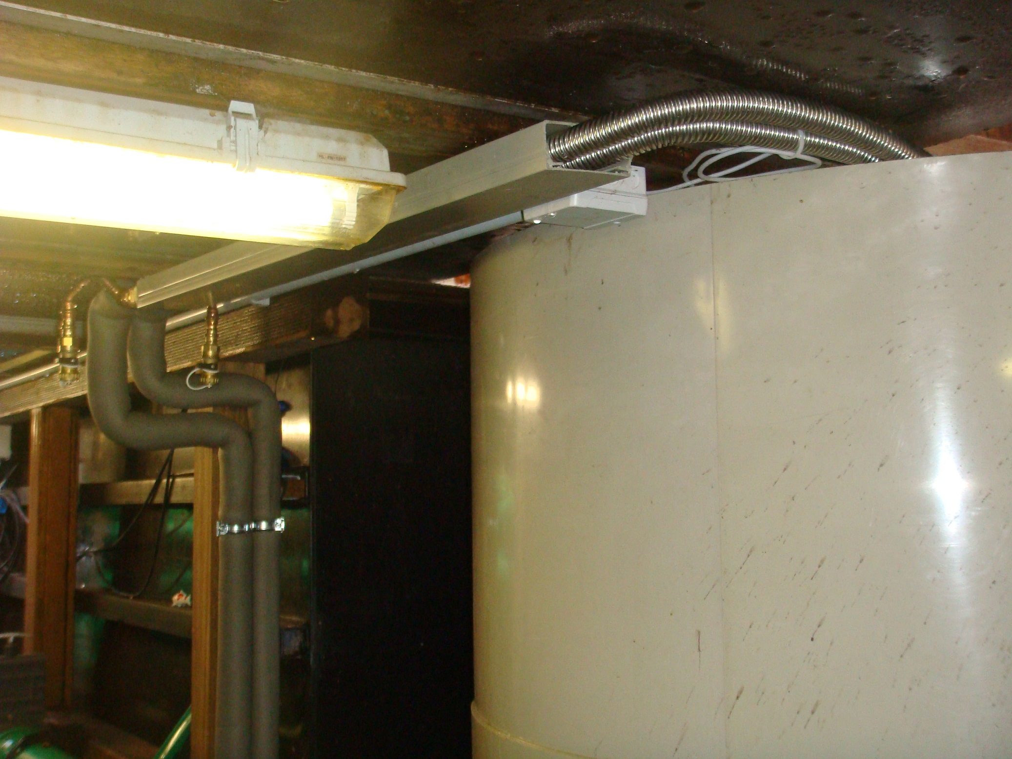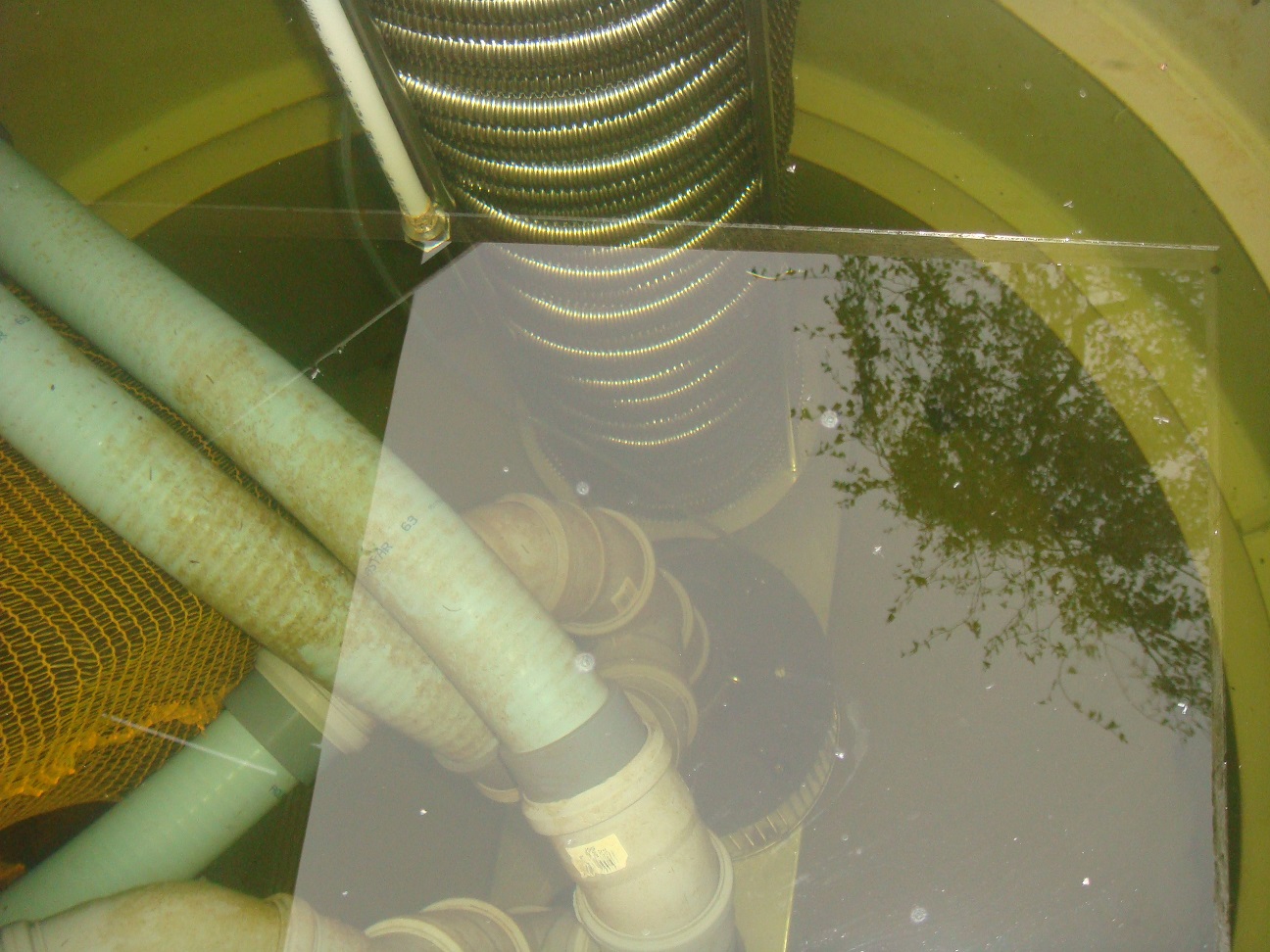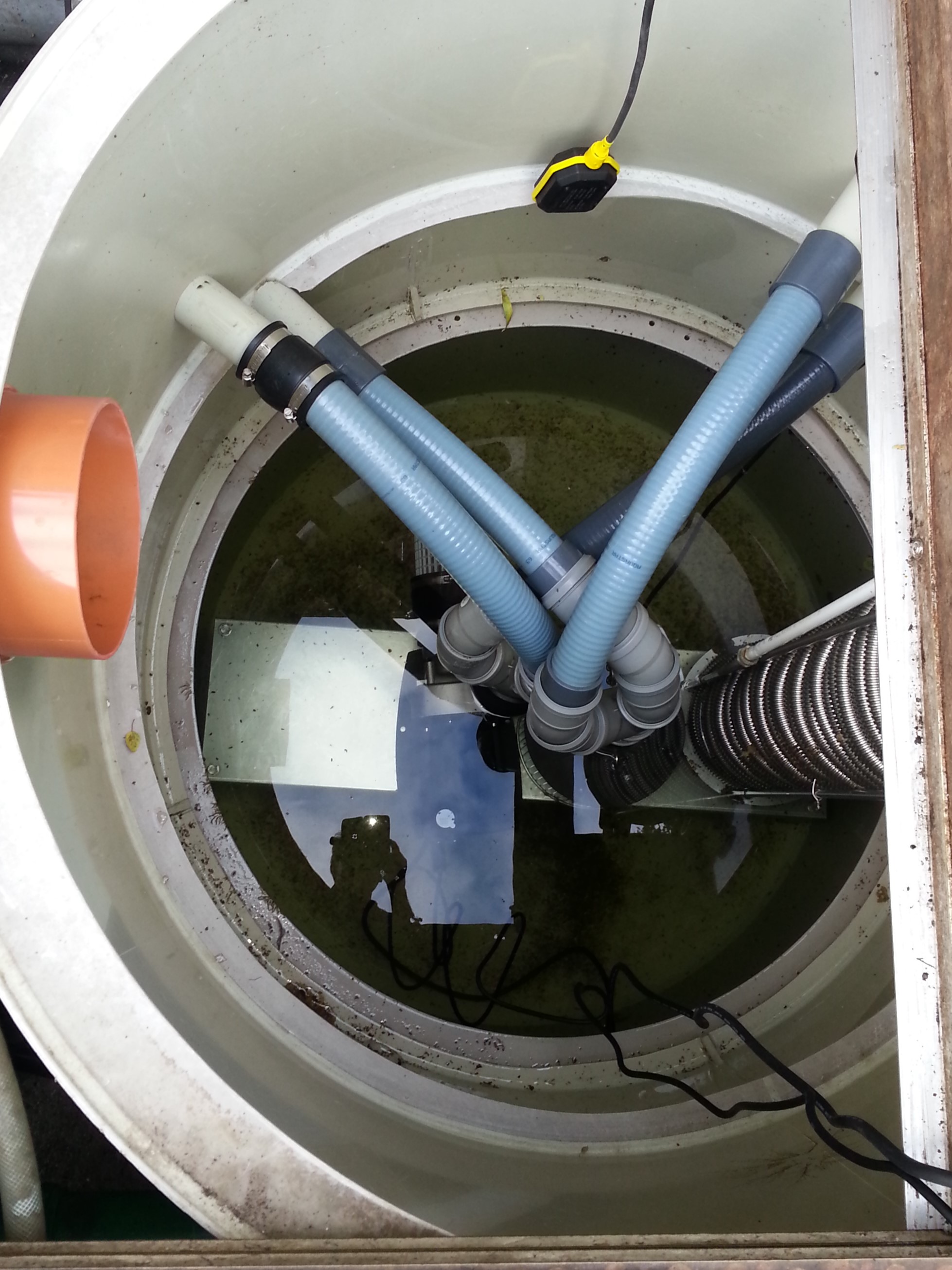Wir haben ein 35m Edelstahlwellrohr (3/4 Zoll) für den WT genommen und nur einen Heizkreis in der Filterkammer vorgesehen. Der 1,2m hohe WT wurde in der PK verbaut und hat einen Querschnitt von 28cm. Da der Filterkeller sehr gut isoliert ist, wird das Rohrsystem - wie auch der Düsenstock vom TF -NUR mit sauberem Leitungs-, Teichwasser gefüllt. Alle Edelstahlwellrohranschlüsse wurden vorsorglich außerhalb der PK verbaut. An den Hochpunkten wurden sinnvollerweise entsprechend die Entlüftungsventile platziert.