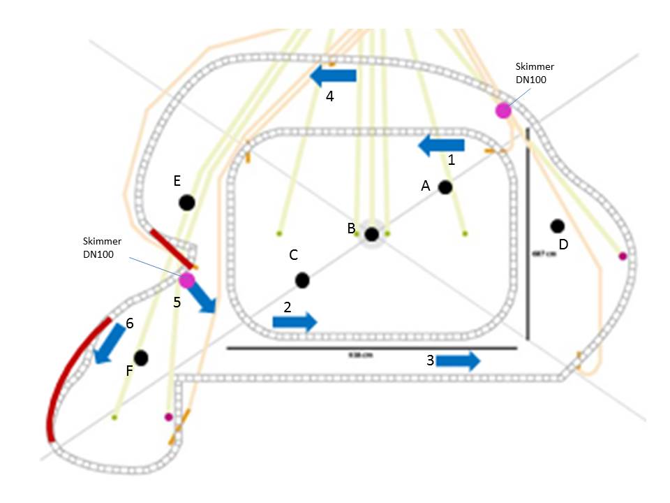ist die Position der Bodenabläufe für mich klar. Mittig! Die Preisfrage ist nun ob es möglich ist den Teich mit seiner komplexen Form und seiner Größe als eine Einheit zu sehen, welche man auch als solche drehen kann. Oder wird es passieren, dass sich mehrere Kreisströmungen und Verwirbelungen einstellen? Sollte dies so sein, wären wiederum Bodenabläufe an den betroffenen Stellen sinnvoll. Zu komplex und Kuddelmuddel.....irgendwelche Wassermassen noch um Ecken bewegen zu wollen...Lass es und bleib bei zwei Kreisströmungen