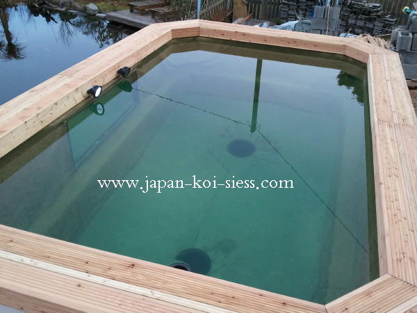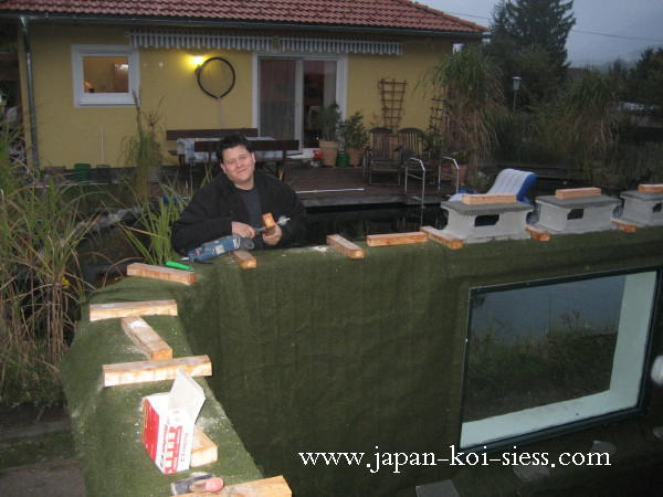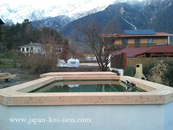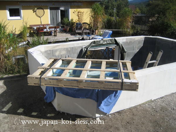 Weiters wird unser Showteich bei Besatz in den kommenden Wintern auch beheizt. Um dabei den Energieaufwand in Grenzen halten zu können kann unser Showteich mittels einer rasch auf- abbaubarer Konstruktion ganz einfach zu einem Koihaus umgewandelt werden.