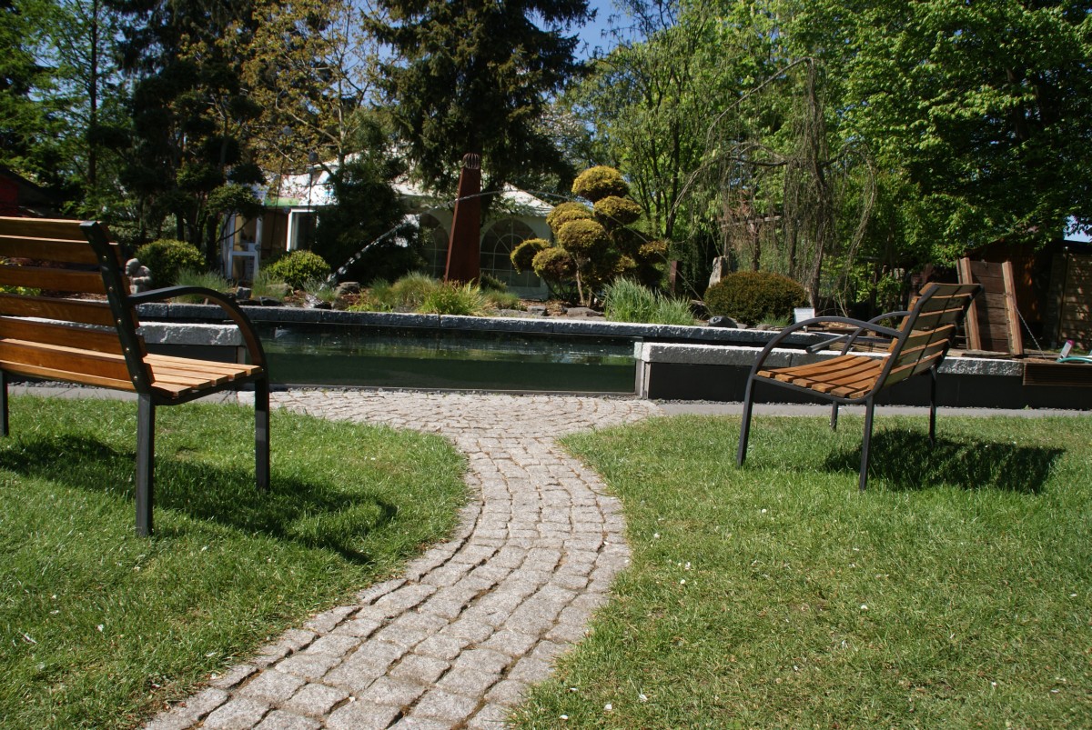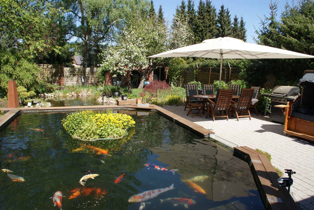 Der Teich ist ebenfalls sehr schön angelegt, neben dem abgetrennten Bereich für die Pflanzmatten sind wieder Sichtscheiben in dem leicht höherliegenden Teich verbaut, und eine Flachzone direkt zum Haus hin, wo natürlich am liebsten gefüttert wird. Neben dem Teich gibt es auf der Bankirai Fläche eine gemütliche Sitzgelegenheit, auf dem der bereits erwähnte Referenzen-ordner zu finden ist.