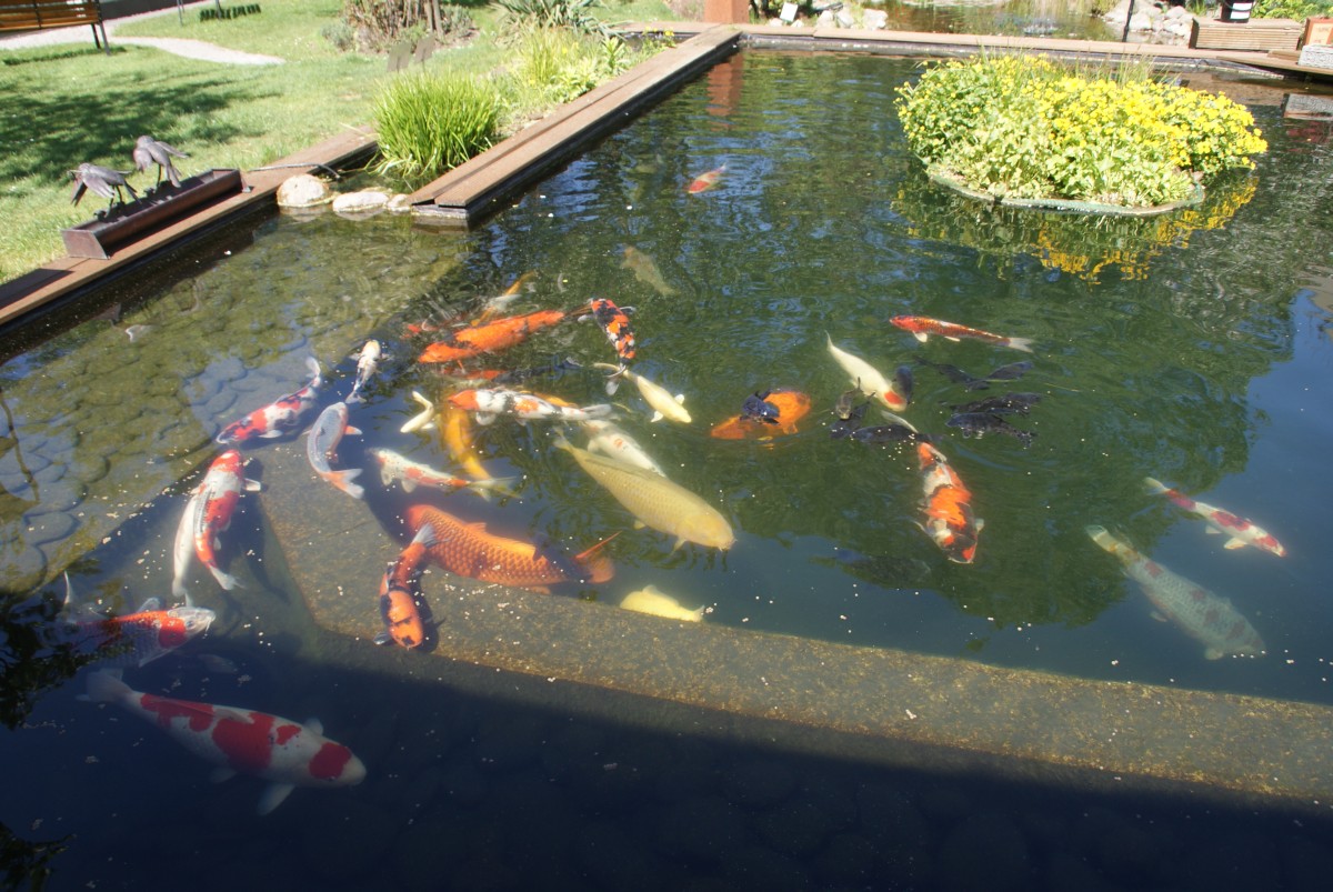 Weiter zum Wohnhaus hin befindet sich dann ein schöner Gartenteich mit Goldfischen und tollem Pflanzenwuchs. Laut einem anderen Hobbyisten hat damit einmal alles angefangen. Man kann von einem Bankirai Weg schön über den Teich blicken. Auf der anderen Seite des Bankirai befindet sich dann das eigentliche Highlight der Anlage. Ein 60m³ Teich, sehr schön angelegt, klares Wasser und ein Top Fischbesatz. Es ist eine Art Pflanzenzone eingerichtet, in der mehrere Pflanzmatten ihr zu Hause haben. Mittig auf dem Teich befindet sich ebenfalls eine sehr große, dicht bewachsene Pflanzmatte, die mit Gewichten auf dem Boden befestigt ist und so immer mittig auf dem Teich schwimmt.