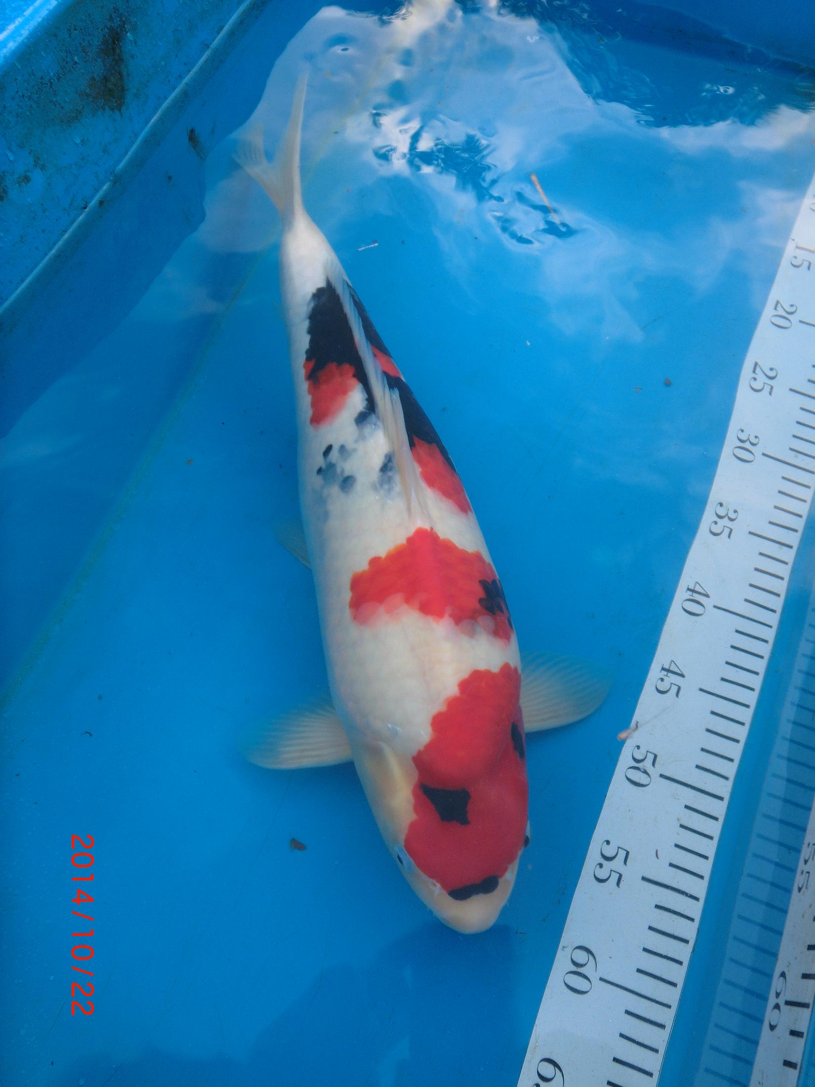 Importiert wurde die Dame von Rhein-Main-Koi im April 2014 als Small-Nisai (der Züchter zieht seine Tosai nicht im Wamrhaus auf und hältert quasi nach der traditionellen Methode) mit ca. 35cm.