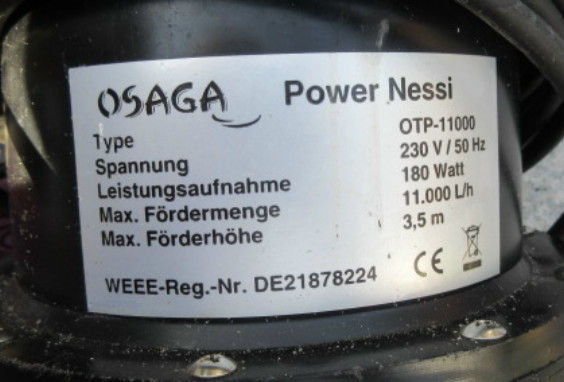 Leistungsaufnahme: 180 W Fördermenge: 11 000 L/H Förderhöhe: 3,5 m