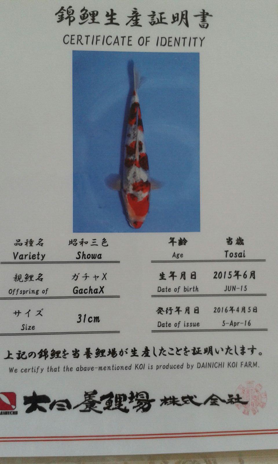 Sollte jemand ein Paket mit super guten Go-Sanke (z. B. für die Aufzucht in einer Innenhälterung über den Winter) suchen, dem kann ich noch folgende beiden sehr hochwertigen original Dainichi Jumbo-Tosai Showa dazu anbieten. Die beiden Fische sind aktuell rund 45cm groß (der Kindai dürfte sogar noch ein Stückchen größer sein) und sie verfügen über ein Blutlinien-Zertifikat der Dainichi Koi Farm in Niigata.