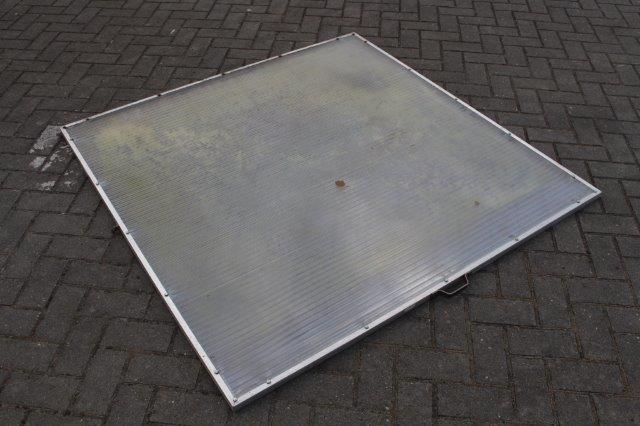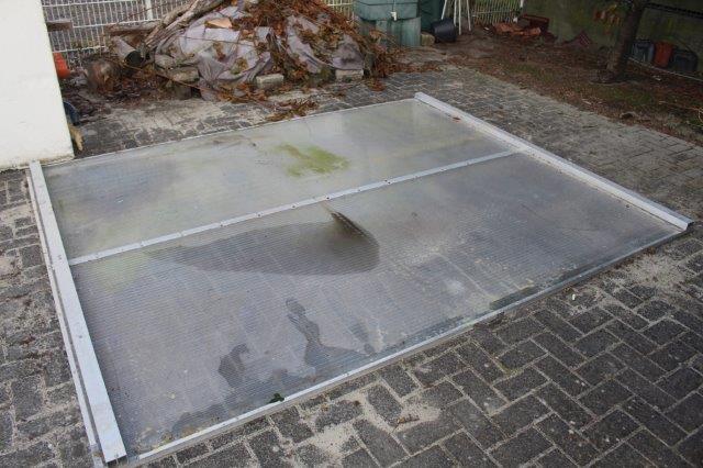 Abdeckung wie oben, ebenfalls aus Hohkammerplatten mit Aluprofilen und Schienen, mit Griff. Abholpreis 50 Euro