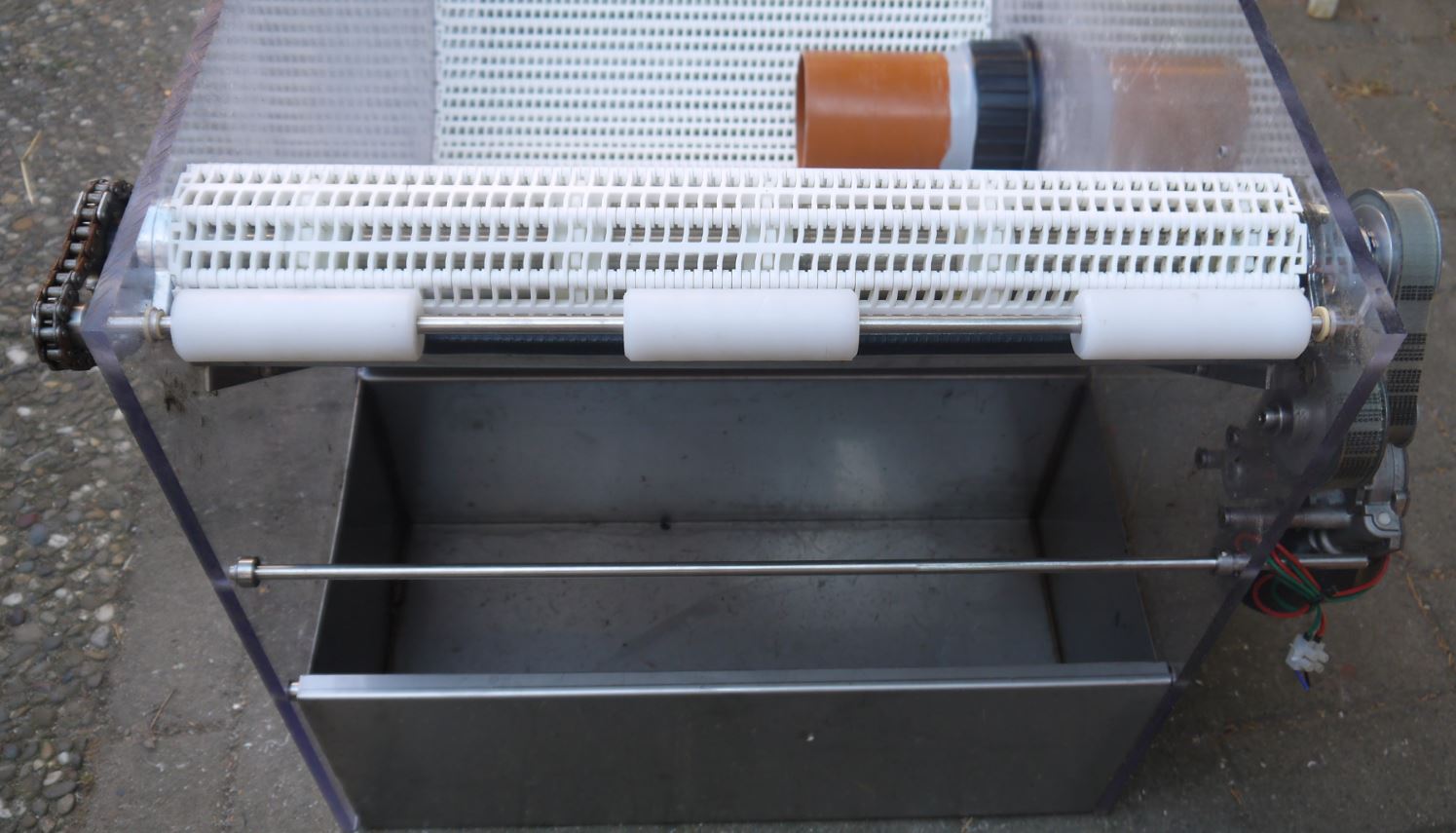 Die Besonderheit und zugleich der Nachteil daran, das ganze ist aus Plexiglas gebaut.Was sich beim maximalen Wasserstand etwas verzieht und damit der Antriebsriemen durchrutscht.(Riemen sind auf dem Bild 2 auf der rechten Seite zu sehen)