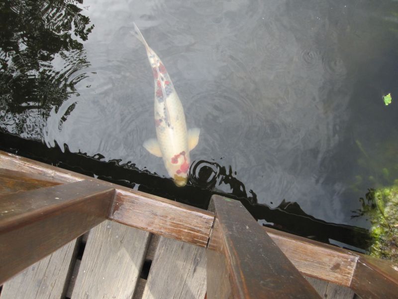 Die Koi sehen alle gesund aus, und ich frage mich, kein Bodenablauf, kein Skimmer, Enten, Gänse und jede Menge Frösche und anderes Getier im Teich, und das funktioniert so. Bei gutem Futter würden die bestimmt 80 cm haben….