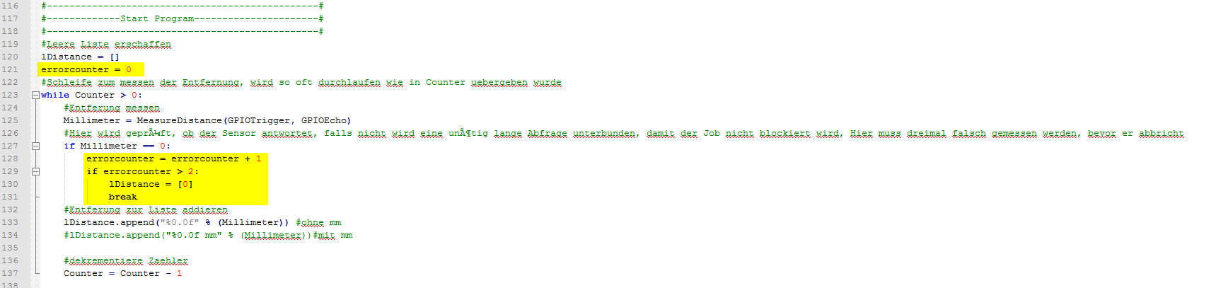 #Schleife zum messen der Entfernung, wird so oft durchlaufen wie in Counter uebergeben wurde