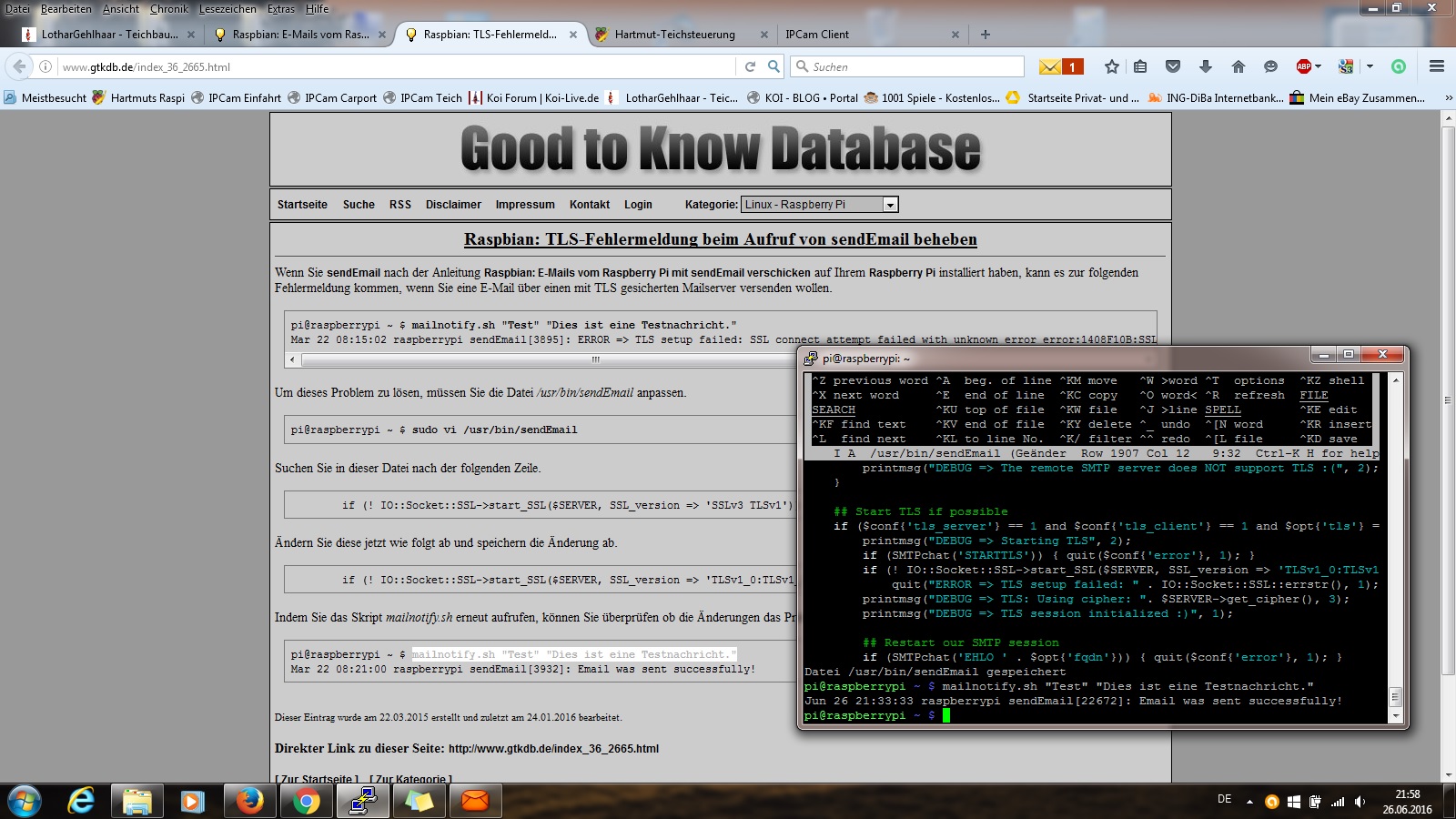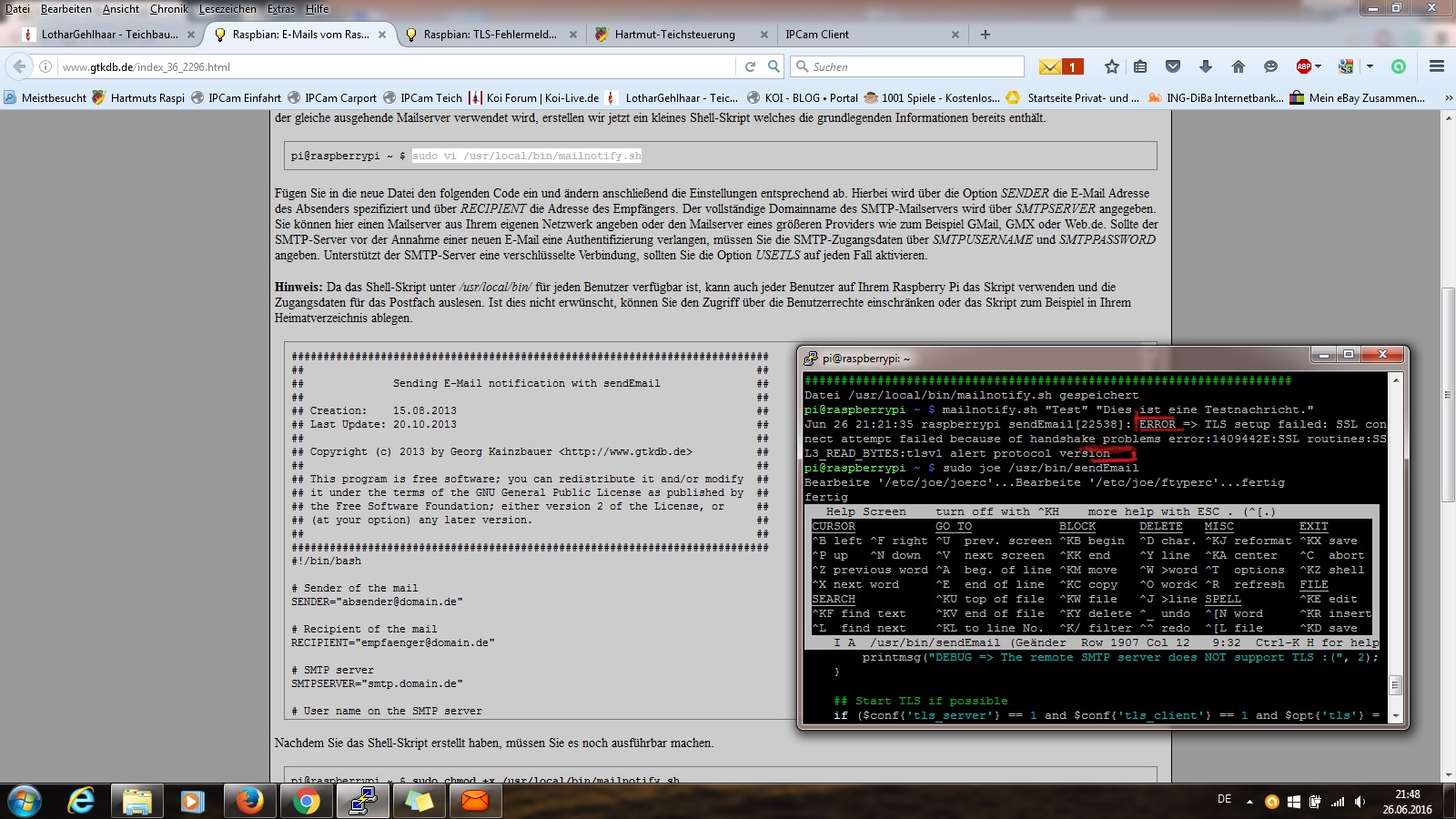 Unsere Teichsoftware ignoriert dieses Skript, sie bastelt den Befehl an sendemail selber zusammen und lässt ihn ausführen. Aus diesem Grunde taugt mailnotify.sh nur begrenzt dazu, die Funktion unserer Software zu testen. Setze bitte lieber den sendemail-Befehl aus dem Protokoll ein, wie oben beschrieben, das führt eher zum Ziel.