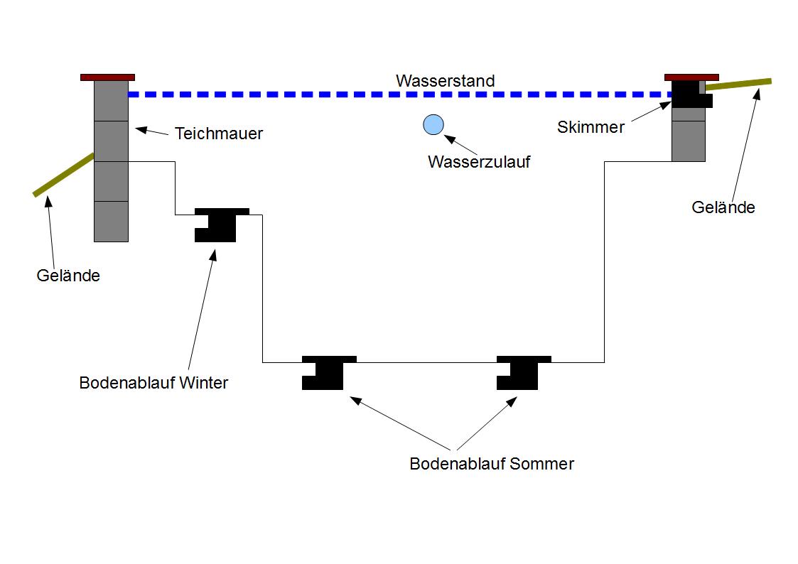 Ich würde dann 3 Bodenabläufe besorgen (2 für den Boden und 1 für Mittelwasserablauf der dann schräg in der Teichwand sitzt)