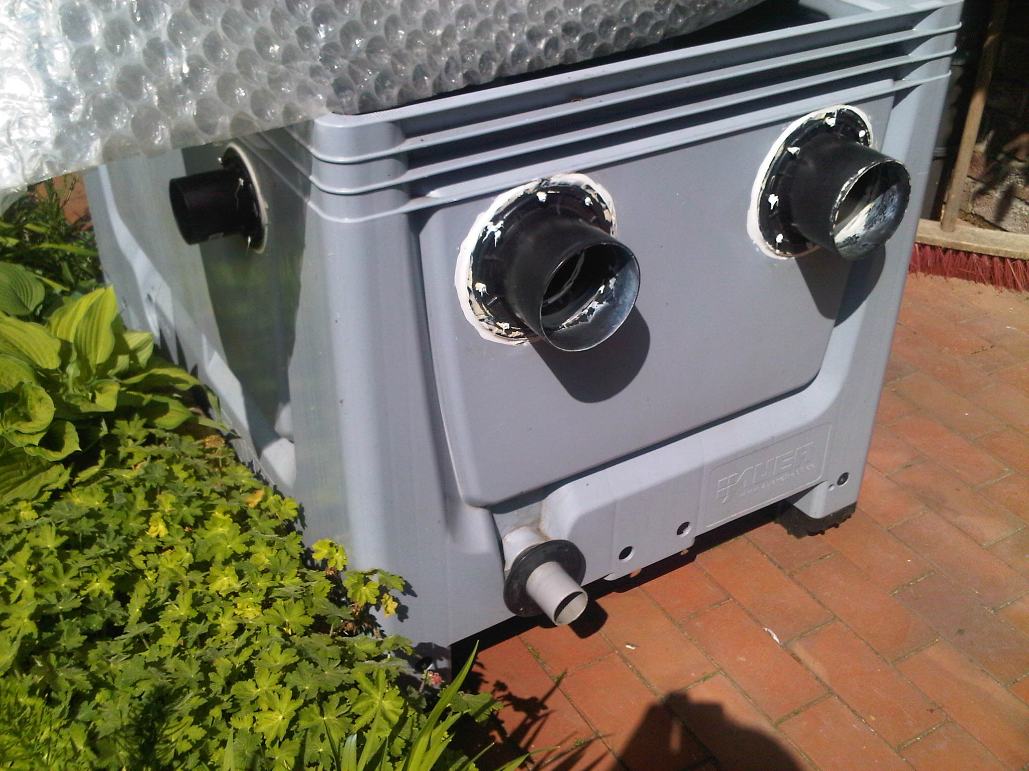 Als Biowanne habe ich einen 500 Liter Kunststoffbehälter (AUER Box) genutzt auf dem der Vliesfilter Aufsatz aufgebaut war.