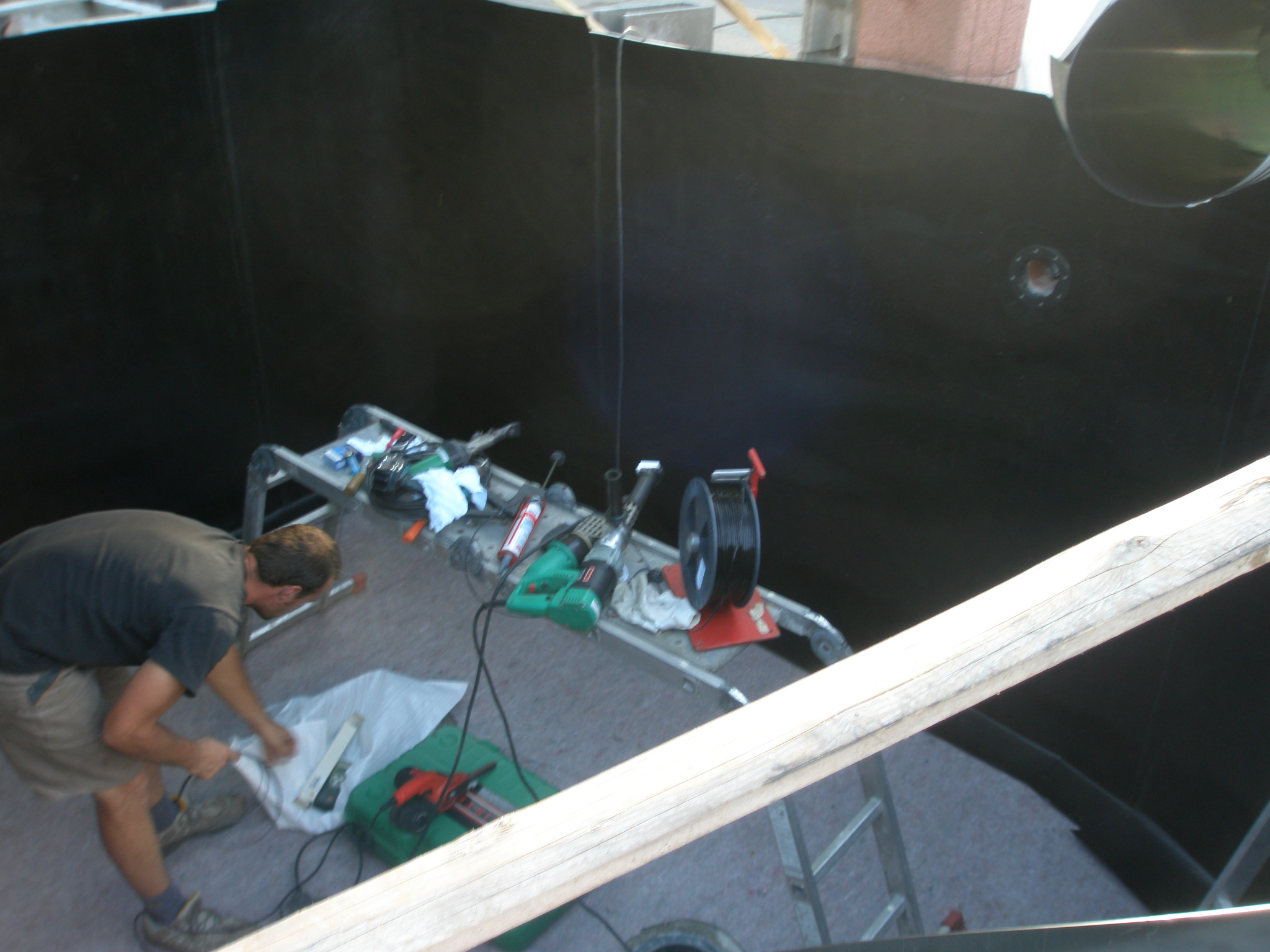 hier sind die Bilder von der PE HD Folie. Filter und Teich wurde innerhalb von 2 Tagen geschweißt. Dank meiner Teichabdeckung konnte auch wärend des Regens gearbeitet werden. Die Folie im Filter wird später an die UK der Terrasse geschraubt und steht deshalb zur Zeit noch über. Bei Fragen einfach schreiben ;D