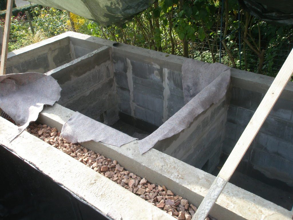 also Teich ist noch ca 25 cm unter Endhöhe; bis jetzt sind knapp 25m³ Wasser eingefüllt. Aber es folgen noch Bilder + Skizze der Terrasse über dem Filter.