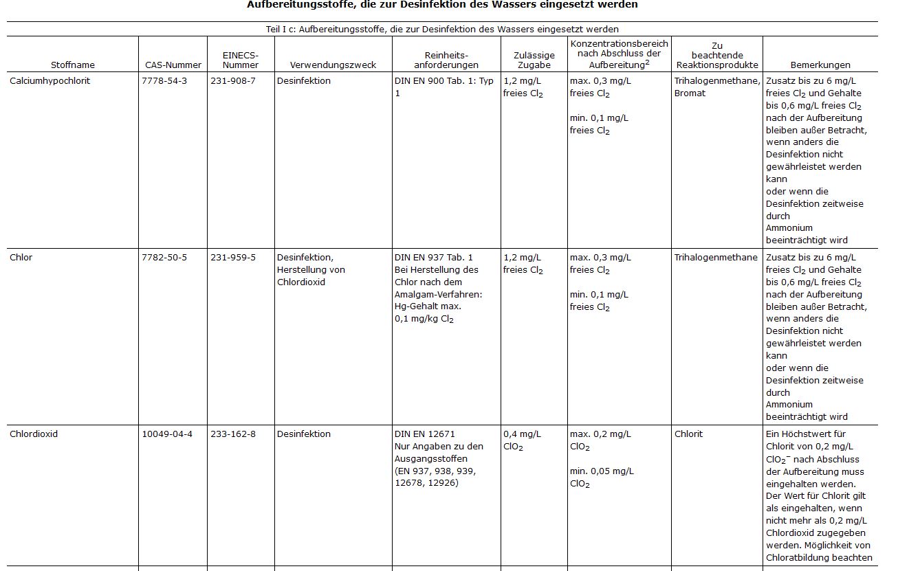 Als Höchstwert für das im Wasser gebildete Chlorit nach der Desinfektion gelten in Deutschland und der Schweiz 0,2 mg pro Liter.[18][41] In Deutschland ist die höchste zugelassene Konzentration nach der Desinfektion für Chlordioxid ebenfalls 0,2 mg/l