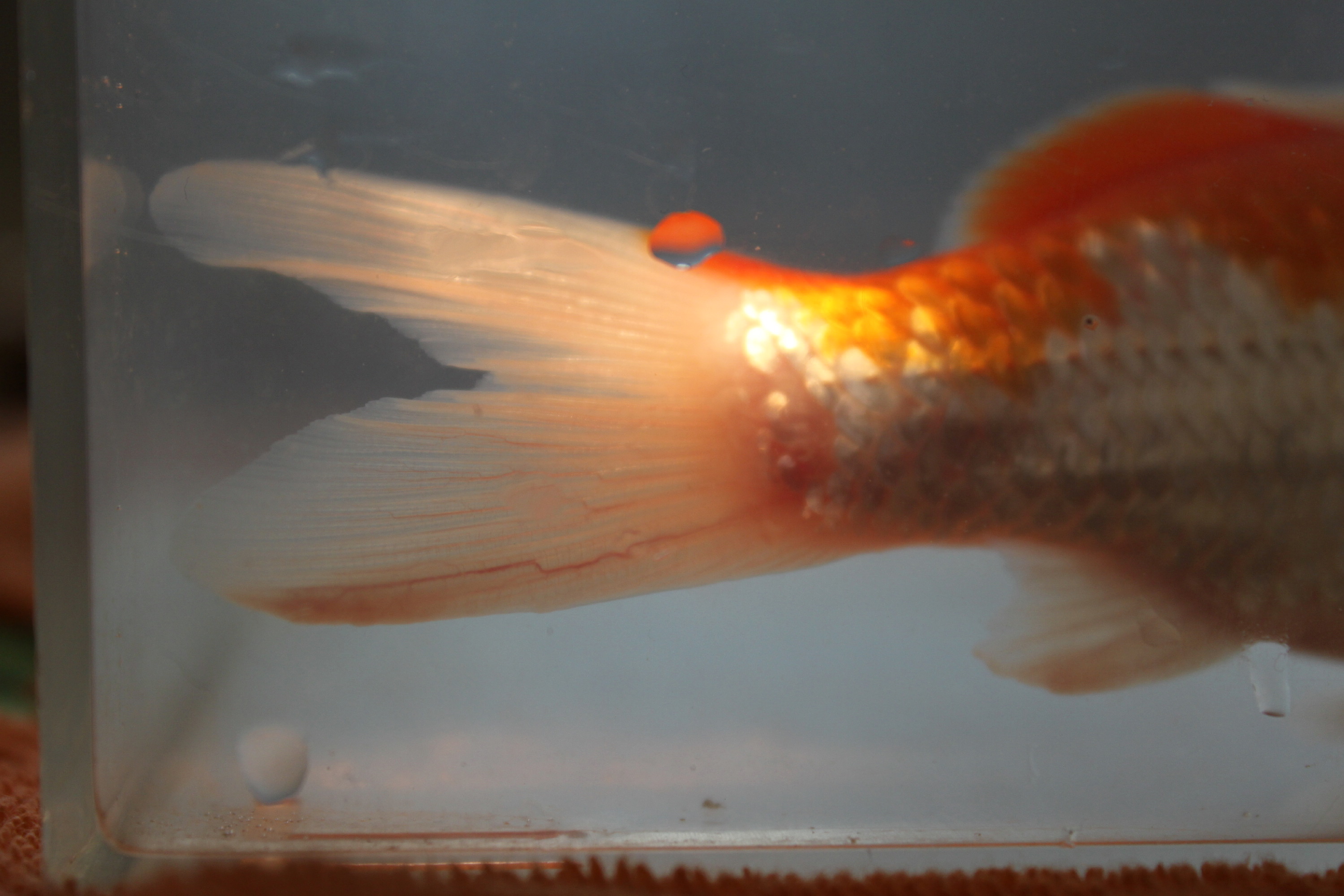 Seht selbst :x. Was ist denn jetzt passiert. Flosse gebrochen wegen der langezogenen roten Linie. Und auch am Ansatz der Flosse ist auf der rechten Seite es gut rot unter den Schuppen auf der linken Seite leicht.