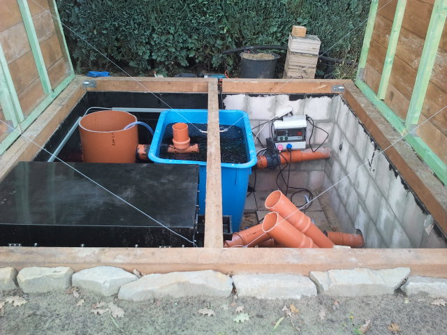 30000 Ltr. Teich, 1,6 Mtr. tief, Filter: Trommelfilter - 110er Luftheber in 400 mm KG Rohr, Bio-Kammer mit Helix, 20 Koi zwischen 20 - 35 cm.
