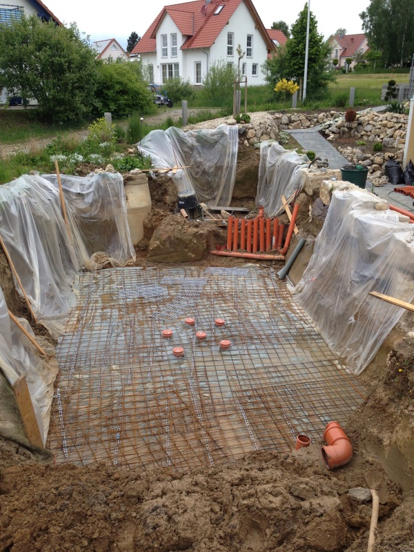 Der rechte Teil wird der Filter, der Linke der Teich. Der höhere Bereich in der Mitte wird die Kammer für den Vorfilter. Da laufen auch die Hausanschlüsse Durch. Die beiden Schächte sind ein Trennsystem mit Schmutz- und Regenwasser.