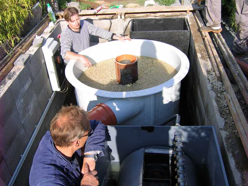 Die T-Griffe sind in der Tat sehr nützlich, vor allem wenn wie in diesem Fall die Rückläufe zum Teich in den Boden der Kammer auf 150cm tiefe angebracht sind, so bleiben die Händchen trocken!