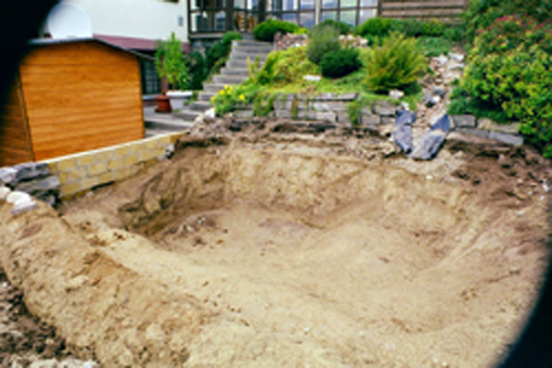 Angefangen habe ich schon im Herbst 2012 mit der Stützmauer zur oberen Terrasse hin. Die Koi's und anderen Fische haben wir in einem 17'000 Liter-Pool mit einer Minimalfilterung untergebracht.