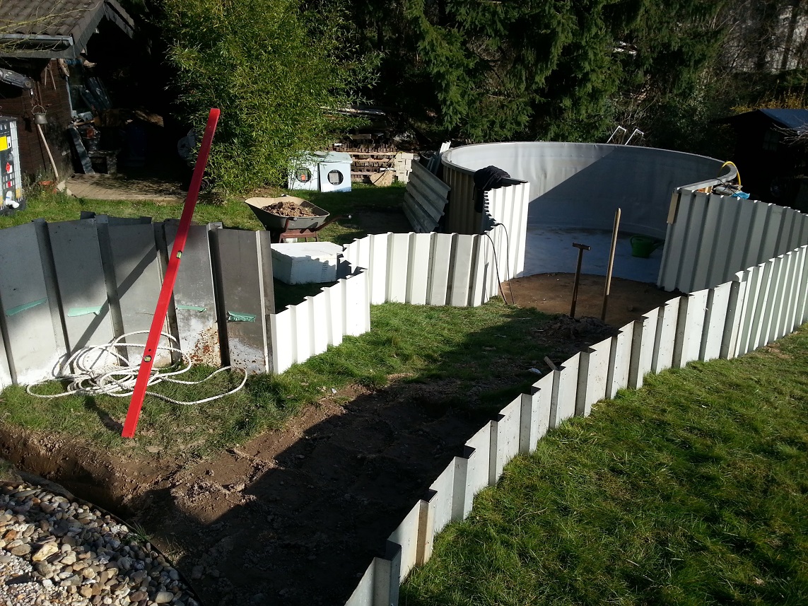Die Teich Wände werden in Stahlblech hergestellt und in der gleichen höhe wie die bestehenden, weiter bis zum alten Teich gezogen.