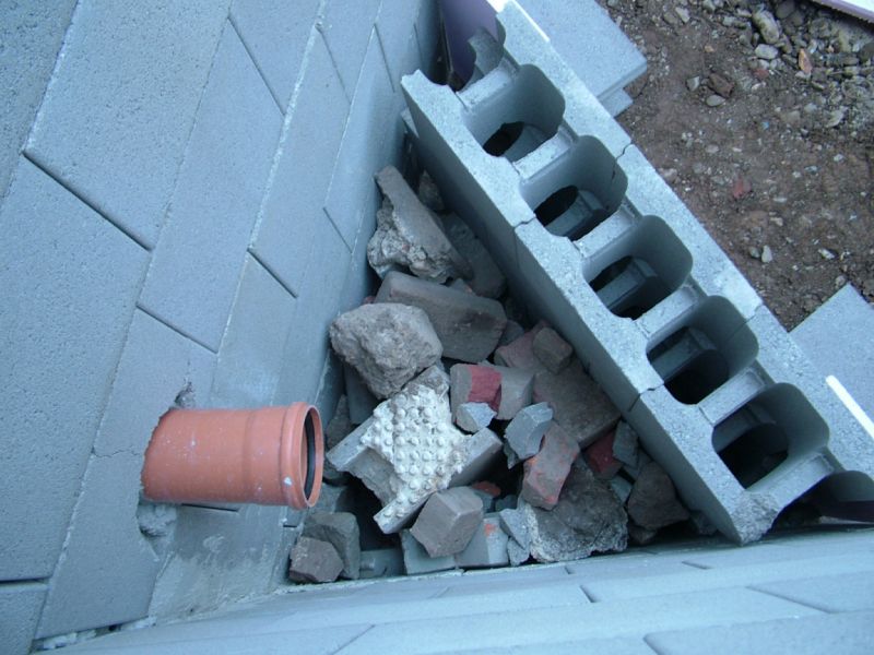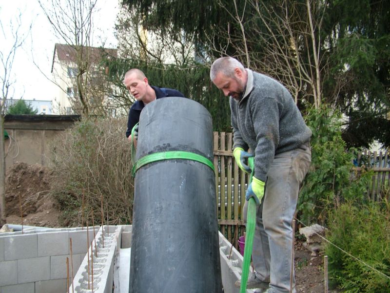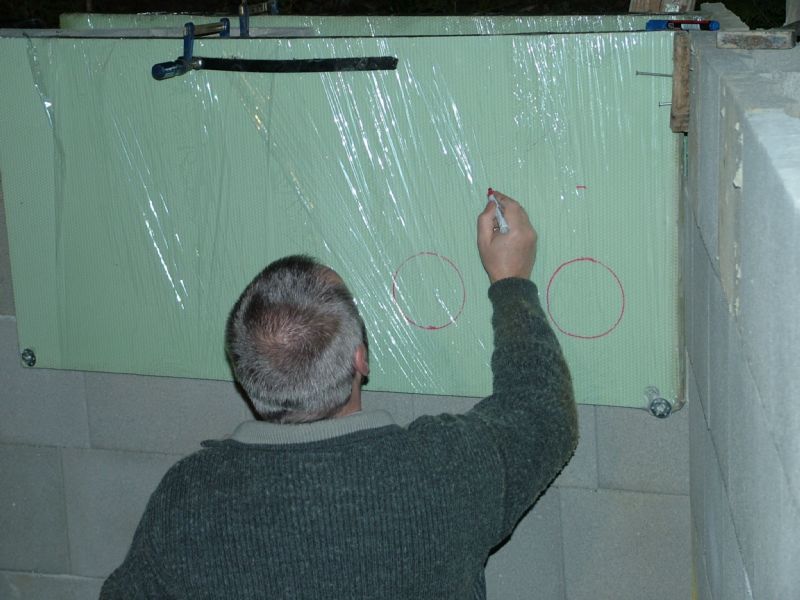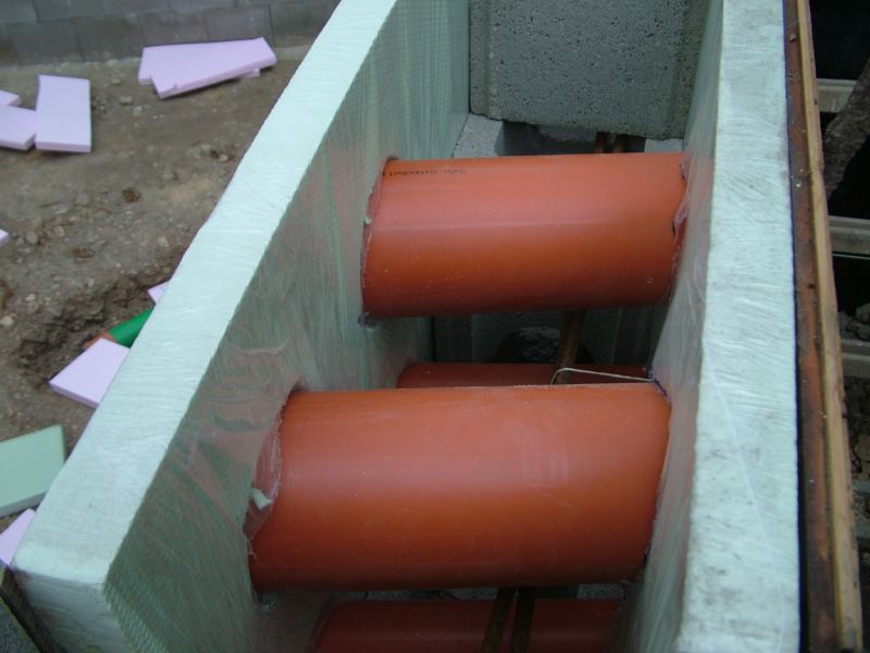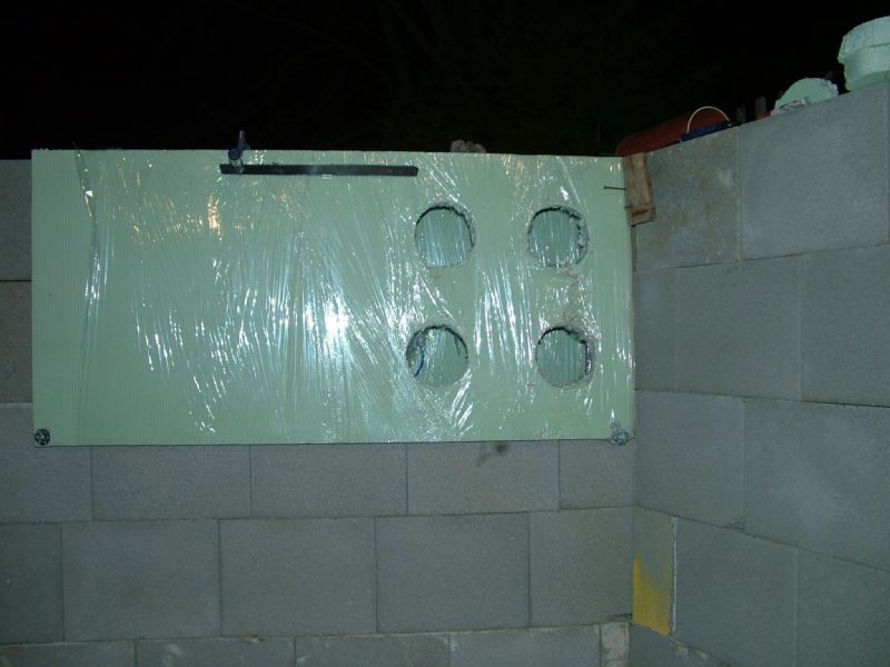 Weil die Rohre für die Rückläufe nicht rechtwinklig durch die Wand geführt werden können, stört jeder einzelne Steg in diesen Steinen. Aus diesem Grunde wurde entschieden, die Schalung ohne Steine auf herkömmliche Art zu bauen.