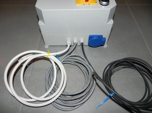 Technische Infos / Zubehör: Hauptschalter Schutzschalter Schalter für Trommelfiltersteuerung Automatik / Aus / Handbetrieb Taster für Handspülen Zeitschalter für Spülzeit 0-50sec Zeitschalter für Pausenzeit 0-5min Steckdose für Anschluss Spülpumpe Netzstecker Anschlusskabel für Trommelmotor 24V Ultraschallsensor mit Anschlusskabel 4 Montagefüße an der Rückseite