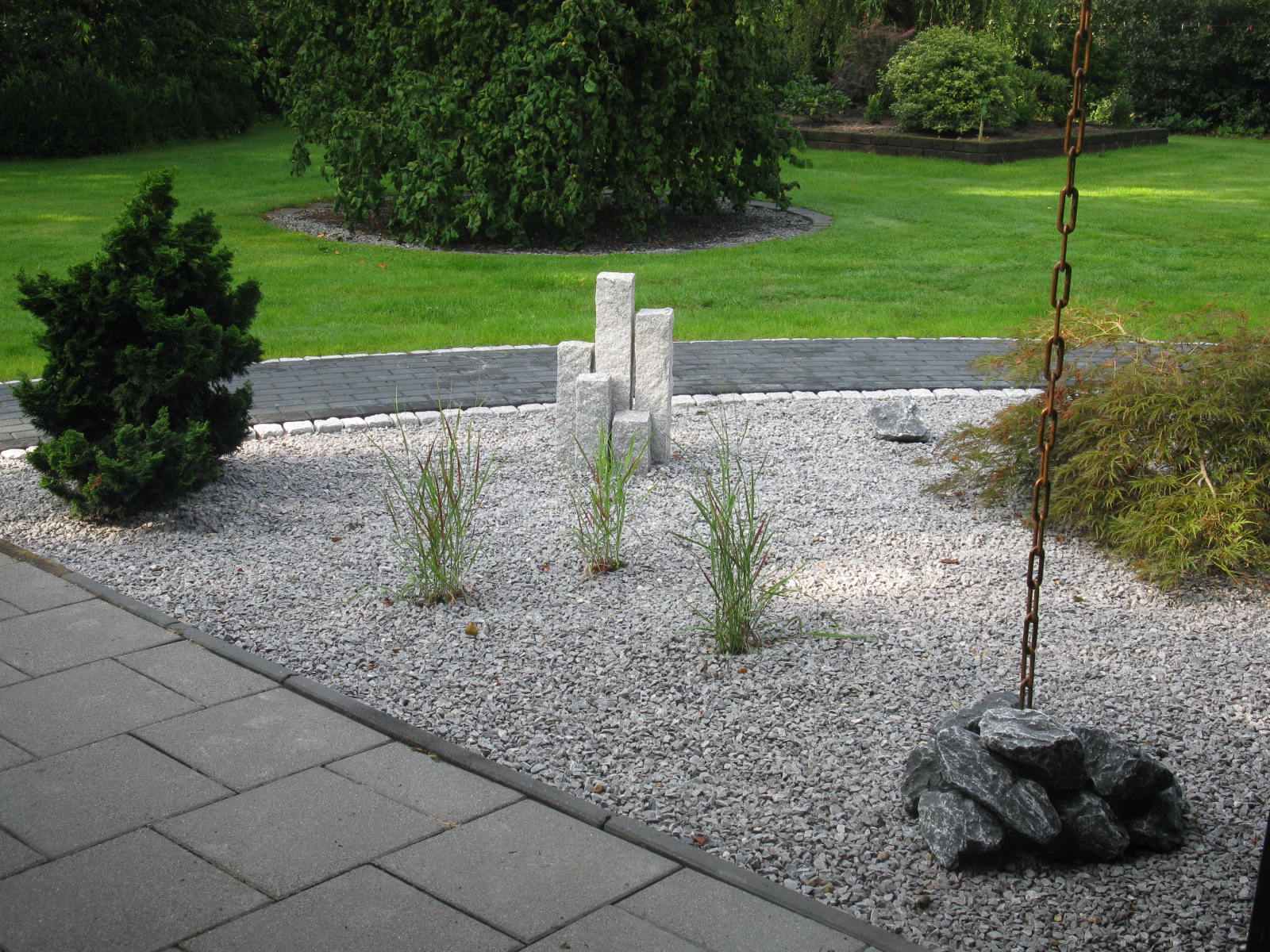 Ist noch nicht ganz fertig, die abgemulchte Fläche rundum wird noch mit Steinbrech bepflanzt.