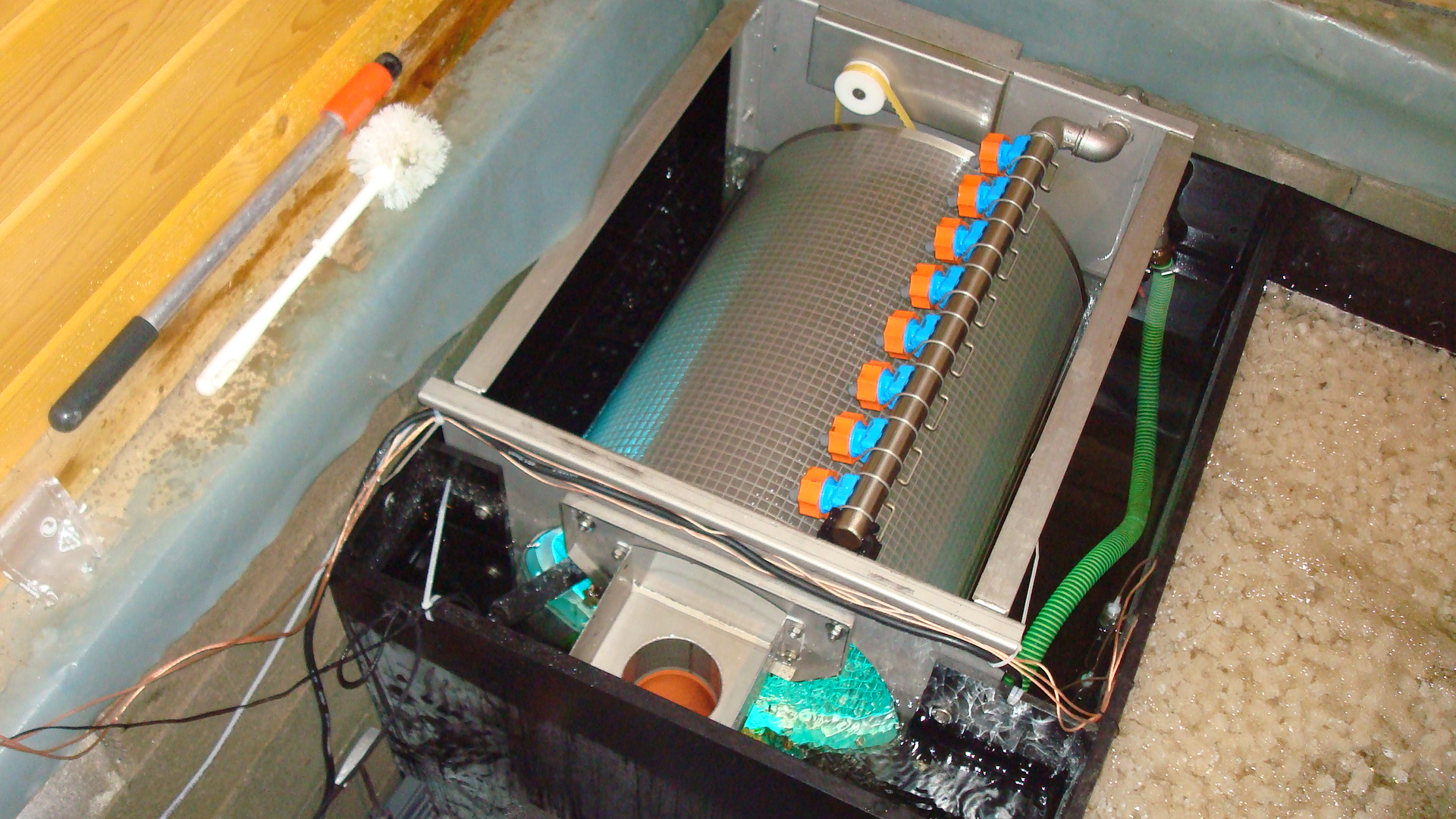 Dann, die Temp. ausserhalb des Teiches, wie im Teich und der Sammelkammer vor oder hinter dem Trommler.