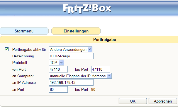 Dann müssen eben diese Eintragungen vorgenommen werden. Der Raspi benötigt natürlich eine feste IP, die unten eingetragen wird.