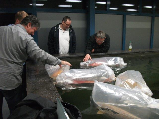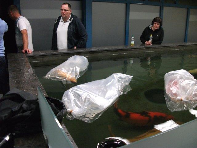 das ist eigentlich kein Problem. Die Koi kommen bei etwa 12 Grad im Flieger an. Die Außentemperatur war in etwa die gleiche und bei uns in der Anlage haben wir die Wassertemperatur vorher auf ca. 15 Grad gefahren, somit mit Anpassung kein Problem. Die nächsten Tage wird die Temperatur in den Becken jetzt bis aus 23 Grad hochgefahren.