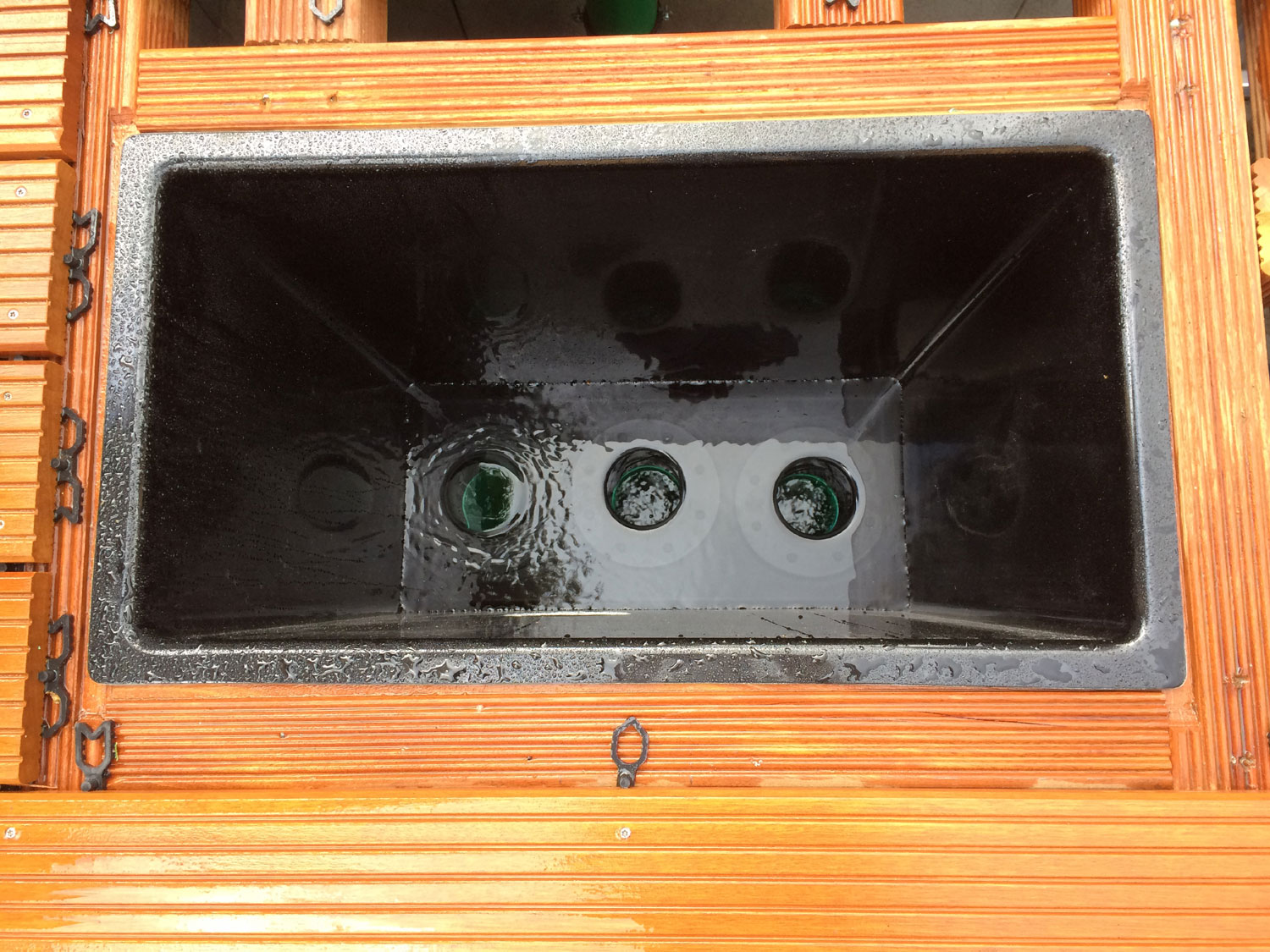 Nach dem Prinzip "keep it simple", worden keine Scharniere an den Klappen verbaut. Da war ich zuerst skeptisch, aber das funktioniert recht gut. Es gibt eine Miniklappe für den Skimmer-Rückhaltekorb, eine für die Sammelkammer und 3 Klappen über dem Filter. Auch die größeren Klappen schaffe ich gut raus und rein zu heben. Das Gewicht ist (noch) nicht zu schwer.