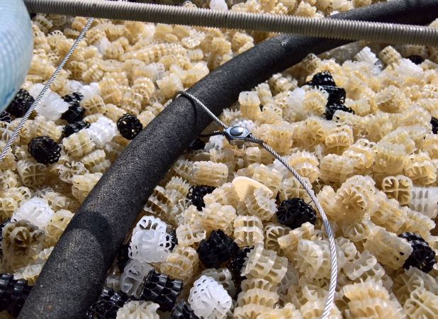 Im Zuge der letzten Umbaumaßnahmen habe ich auch die Belüfterplatte in der Biologie gegen meinen bisherigen Genesis Teich-Belüfterring (im Teich ist jetzt ein kleinerer von Benni mit einer Hiblow 40) getauscht, um das Hel-X (von 200 Liter auf 400 Liter aufgestockt) besser und großflächiger bewegen/belüften zu können.