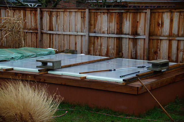 Was man auch gut erkennen kann, das sind die solaren Gewinne unter der Teichabdeckung aus Doppelstegplatten.