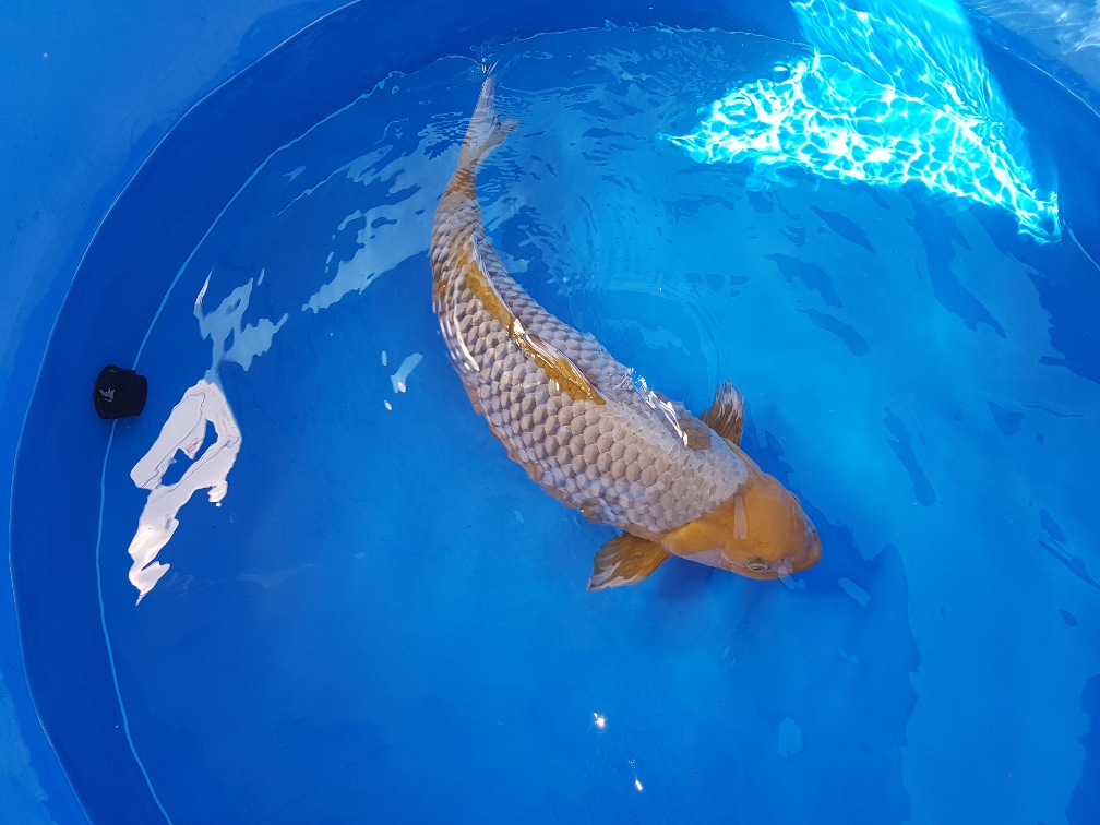 nach einigen Neuzugängen zu Beginn dieser Saison müssen wir nochmal ein bisschen Platz im Teich schaffen. Da wir verstärkt auf Gosanke setzen, fiel die Wahl beim Reduzieren auf unser handzahmens Ochiba Shigure Mädchen.