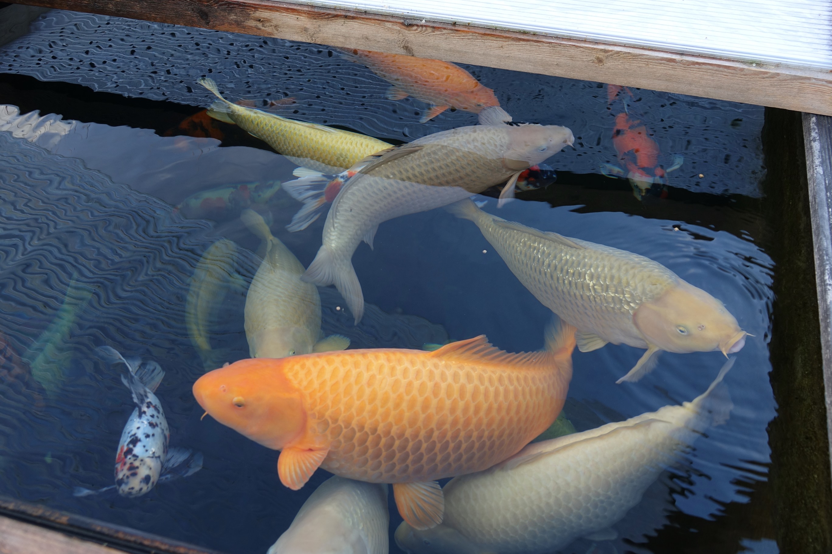 Die Koi schwimmen weiterhin bei 9-10 Grad Wassertemperatur.
